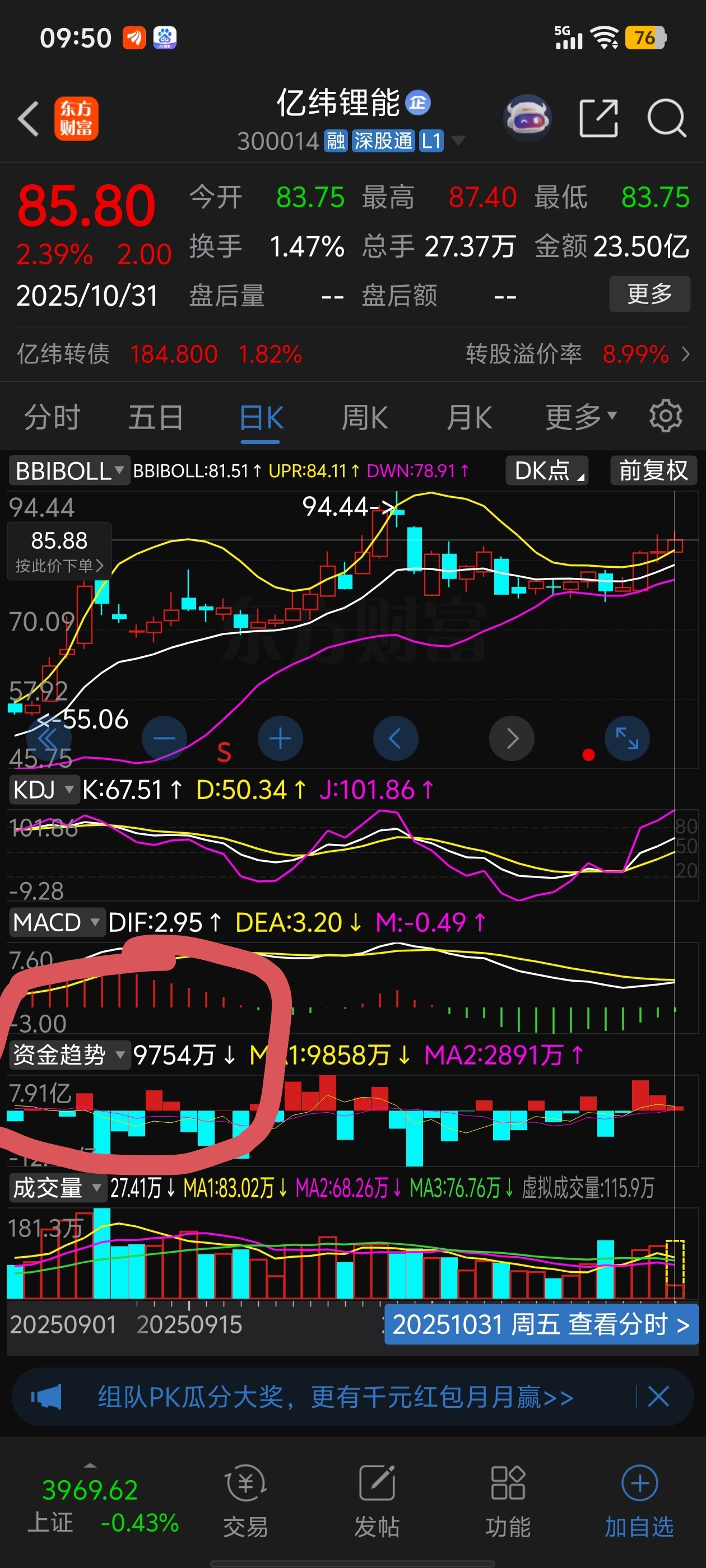 $亿纬锂能(SZ300014)$ 各位大佬,这个箭头向下是什么意思呀?有时候朝上有时候朝下的。