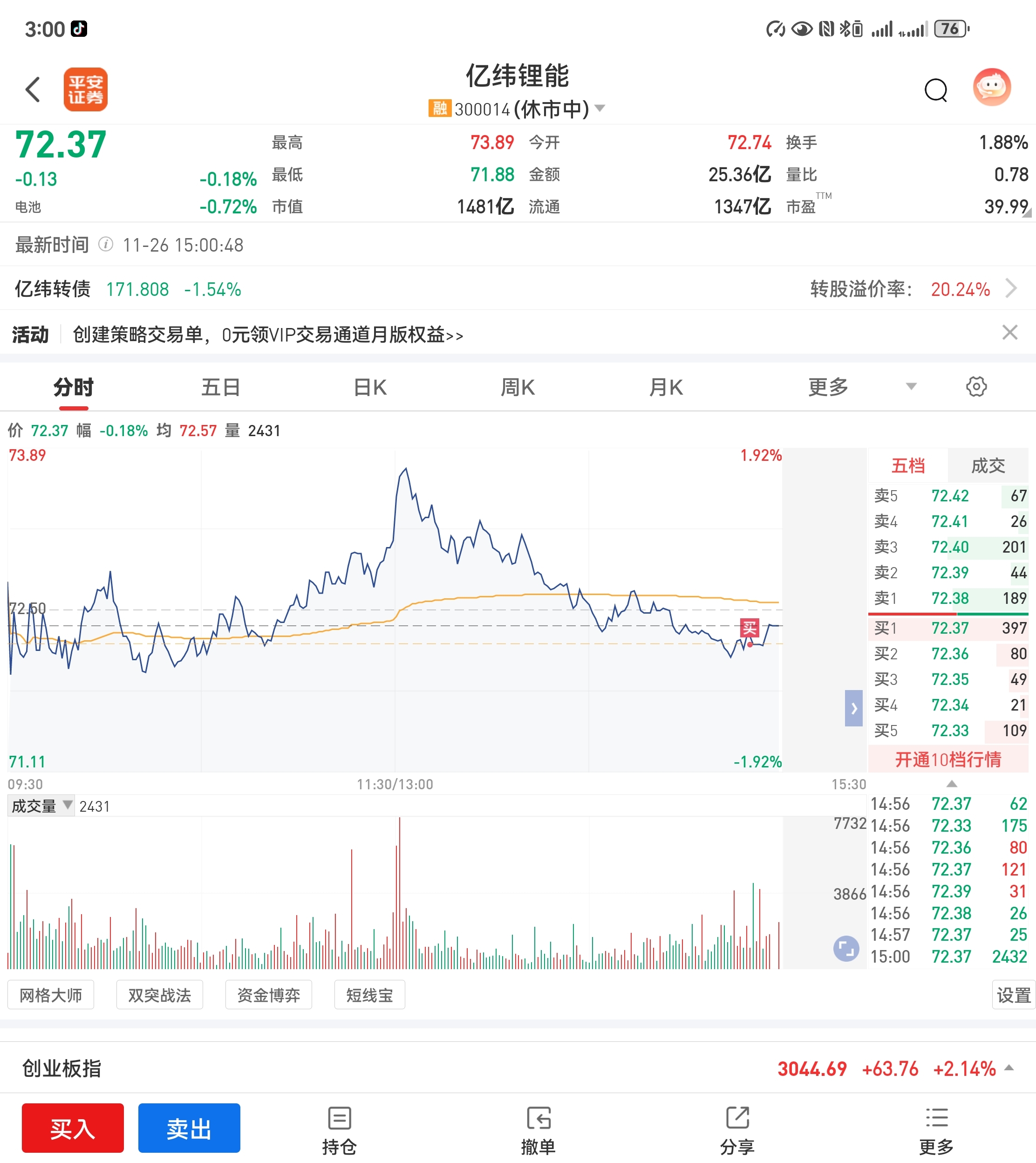 $亿纬锂能(SZ300014)$ 尾盘买入,大爷明天10点前就卖了他,一个点就走!