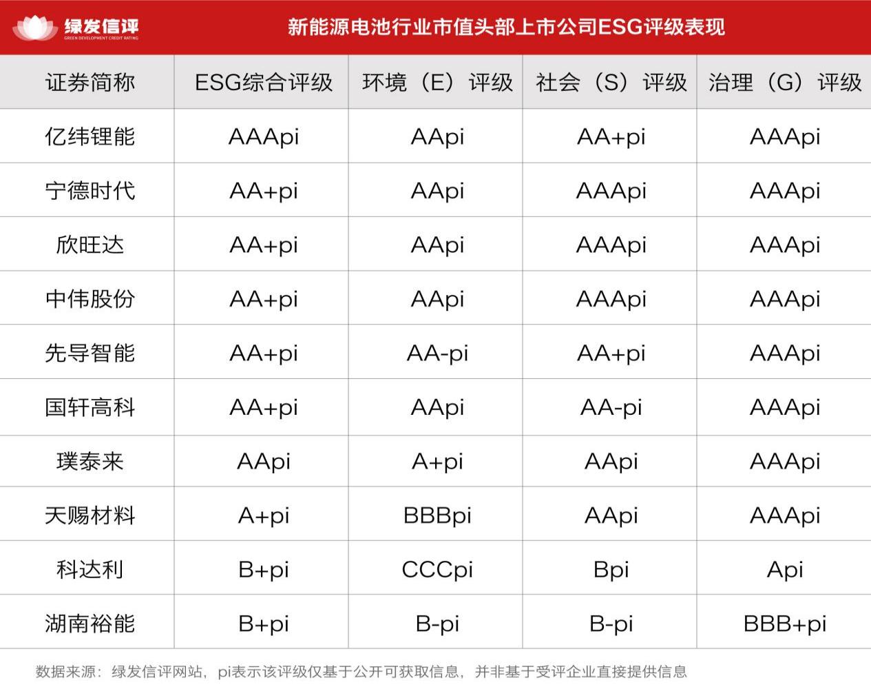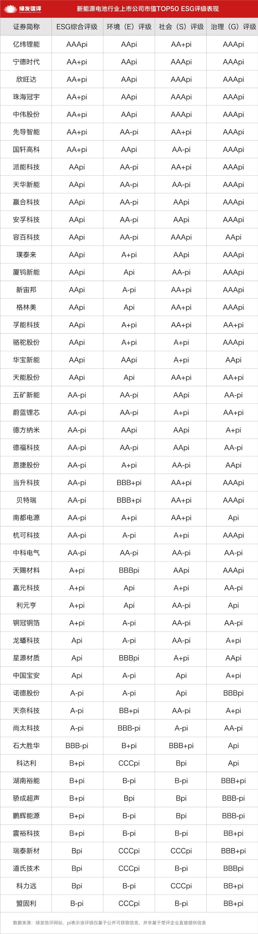 根据绿发信评官网数据,除头部十家企业外,珠海冠宇获得AA+pi评级;派能科技、天华新能、赢合科技、安孚科技、容百科技、璞泰来、厦钨新能、新宙邦、格林美、孚能科技、骆驼股份、华宝新能和天能股份获得AApi评级;五矿新能、蔚蓝锂芯、德方纳米、德福科技、恩捷股份、当升科技、贝特瑞、南都电源、杭可科技、中科电气获得AA-pi评级;嘉元科技、利元亨和铜冠铜箔获得A+pi评级;龙蟠科技、星源材质和中国宝安获得Api评级;诺德股份、天奈科技和尚太科技获得A-pi评级;石大胜华获得BBB-pi评级;骄成超声、鹏辉能源和震裕科技获得B+pi评级;瑞泰新材、道氏技术和科力远获得Bpi评级;盟固利获得B-pi评级。