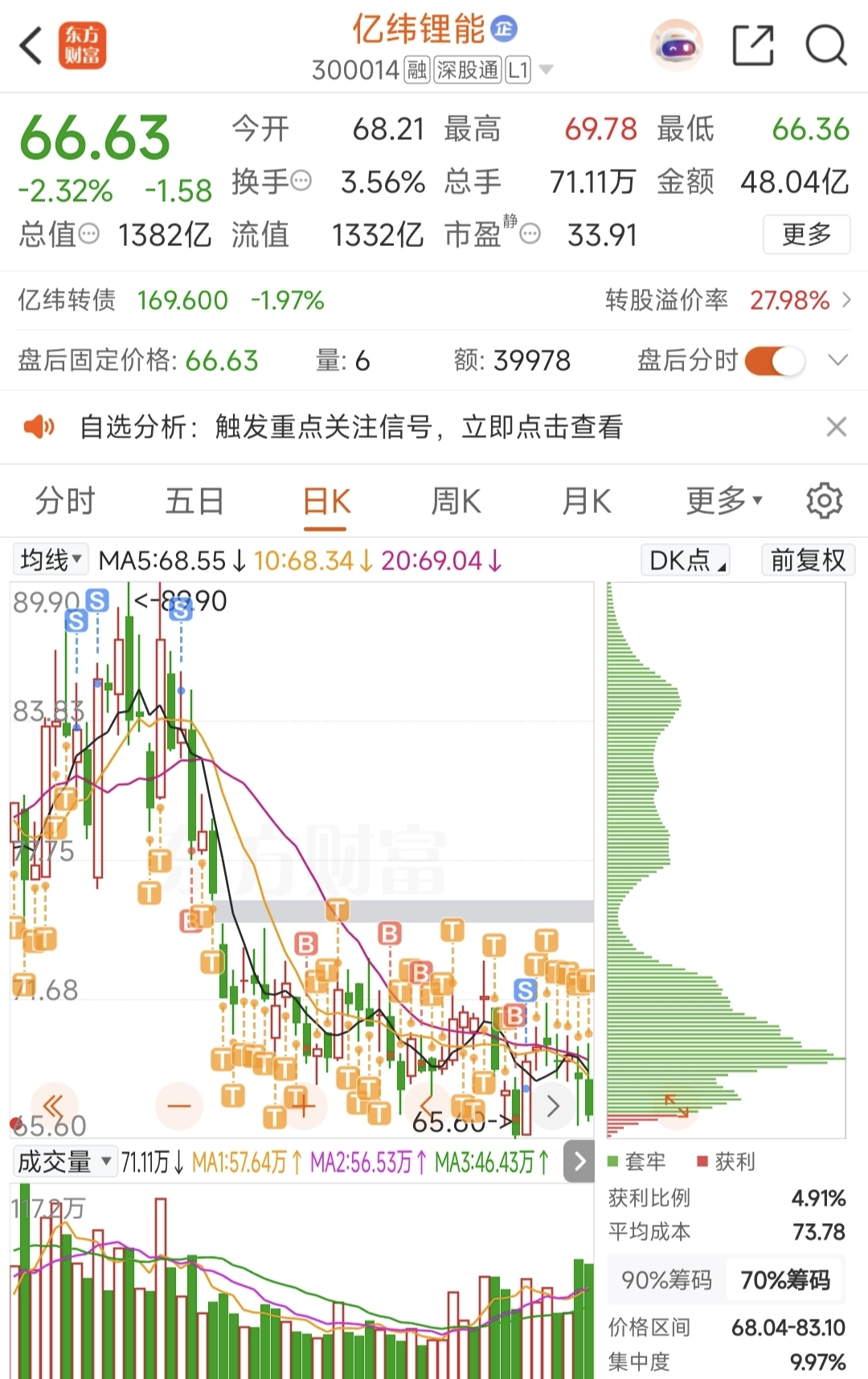 $亿纬锂能(SZ300014)$ 我85卖了,75接回来,一直做T成本做到69了,感觉快扛不住了啊