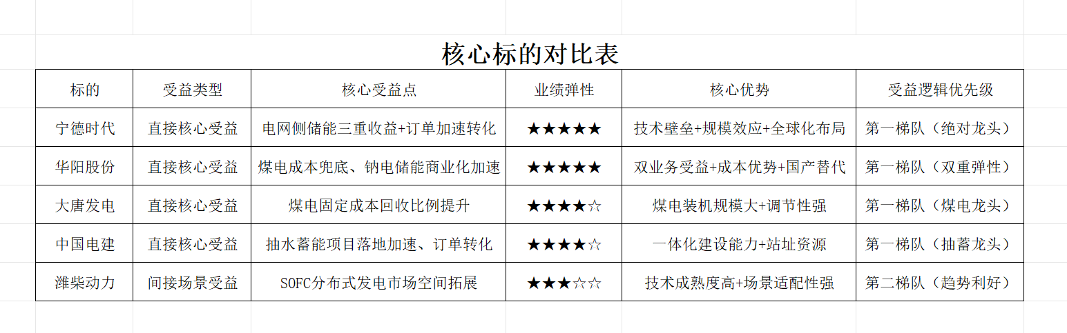 今天盘后,两部门发布了《关于完善发电侧容量电价机制的通知》,开启电力市场从“电量补偿”到“容量补偿”的范式革命,煤电、电网侧独立新型储能、抽水蓄能、气电四类企业成为直接且最大受益者,行业盈利逻辑、估值体系和整个电力生态迎来重构;宁德时代与华阳股份同为核心受益标的,前者凭借全球储能龙头地位与技术壁垒抢占政策红利制高点,后者依托“煤电+钠电储能”双业务兑现双重弹性;潍柴动力为场景拓展型受益标的,SOFC分布式发电借政策东风打开市场空间,利好长期发展。