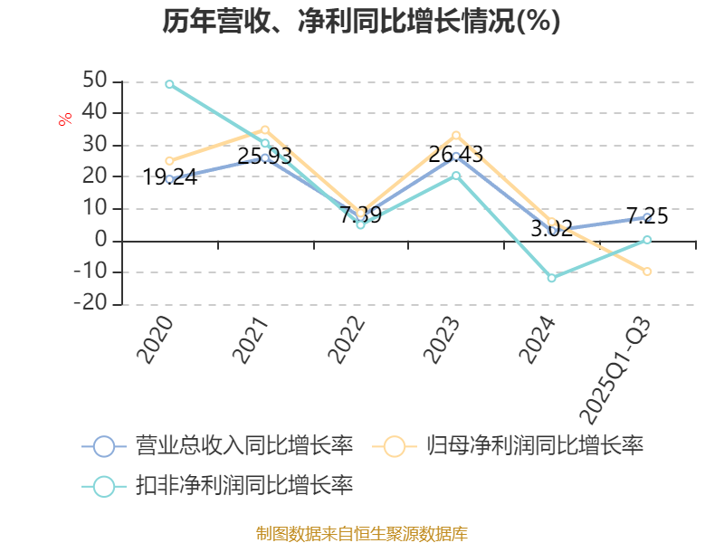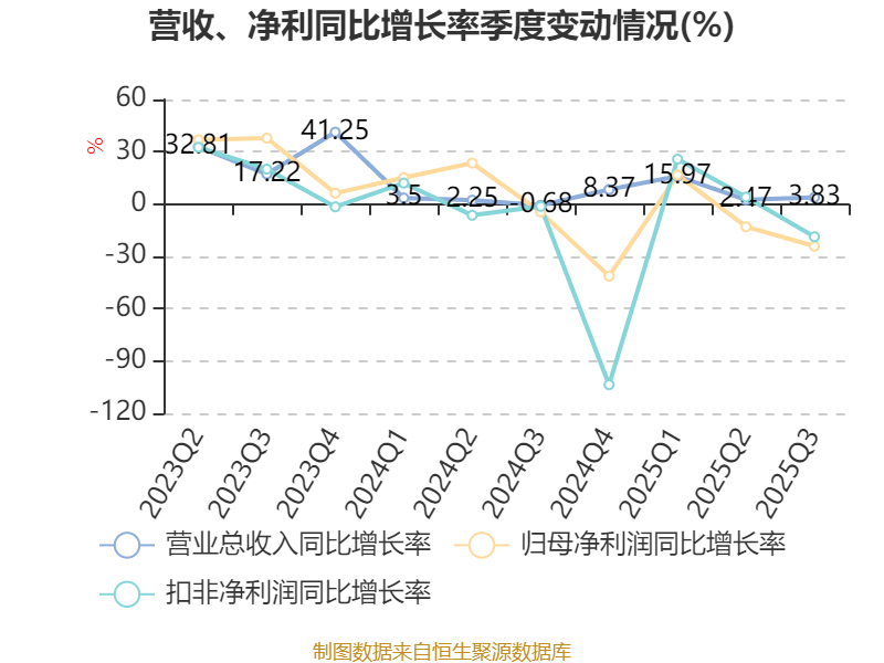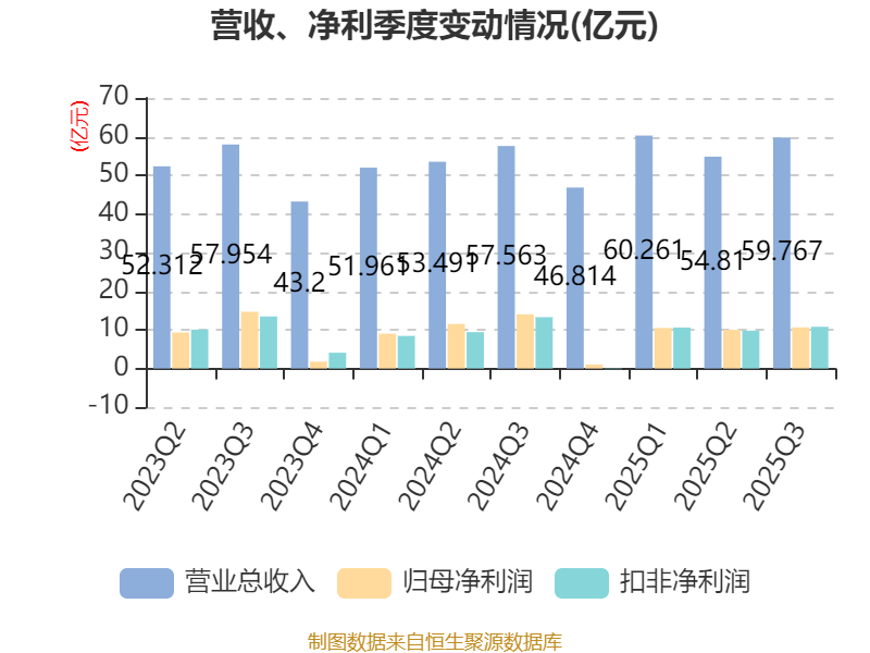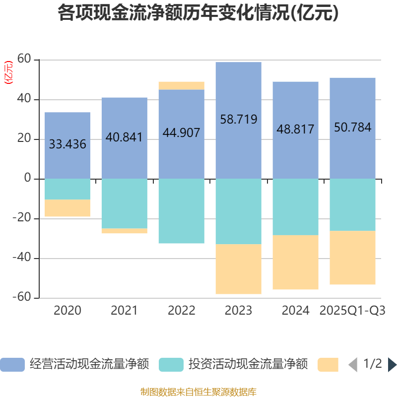 2025年前三季度,公司经营活动现金流净额为50.78亿元,同比增长18.14%;筹资活动现金流净额-26.99亿元,同比增加4.16亿元;投资活动现金流净额-26.33亿元,上年同期为-24.19亿元。