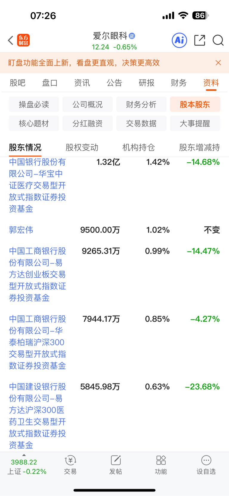 $爱尔眼科(SZ300015)$ 你们没看股东吗?基金什么的全跑完了,这么大市值谁接的动?涨不了的,基金团队不比你们聪明?大牛市被套在这个股里,确实停狠。