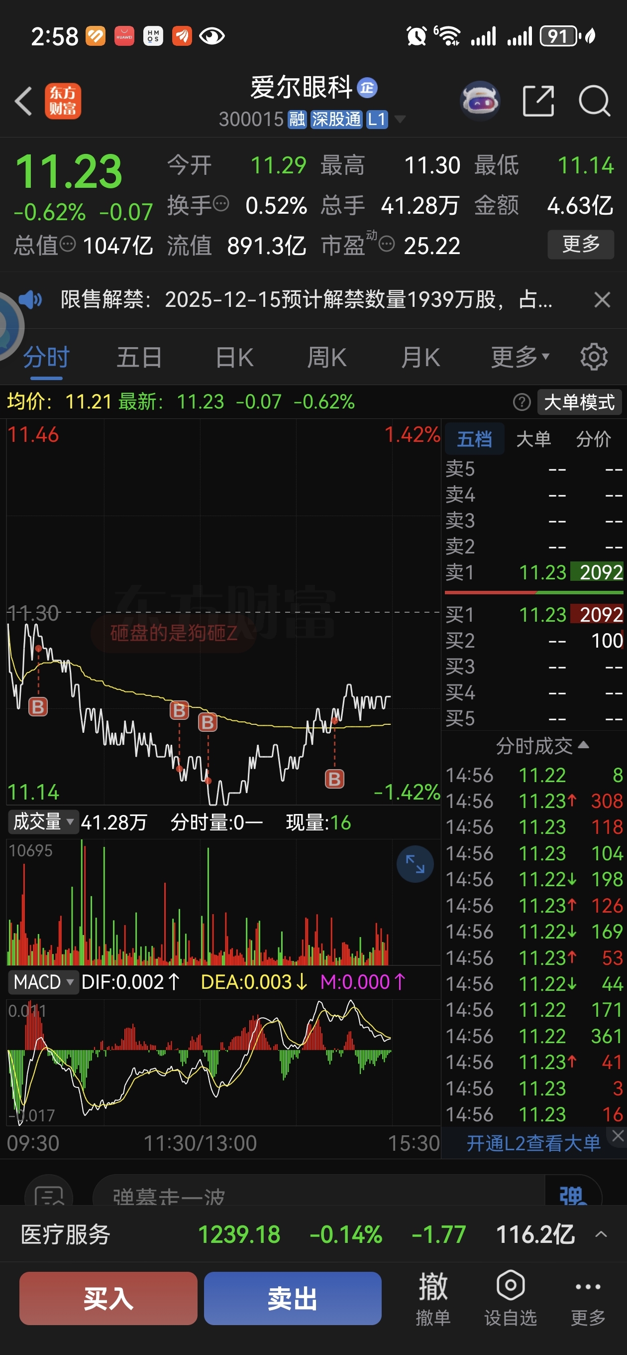 $爱尔眼科(SZ300015)$ 之前抄的底11.43出了,还以为卖飞,这次的下杀买一些回来。