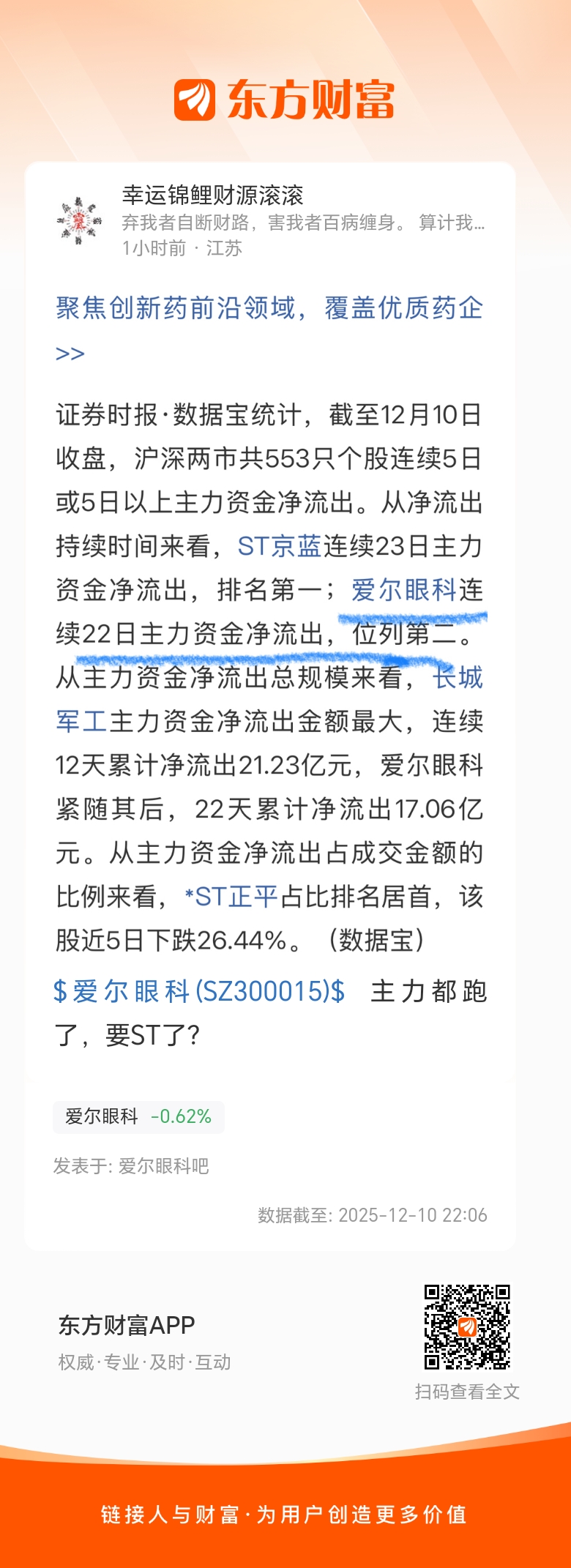 $爱尔眼科(SZ300015)$  主力都跑了,要ST了?
