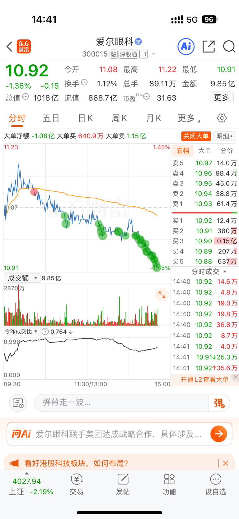 $爱尔眼科(SZ300015)$ 300万大单成交