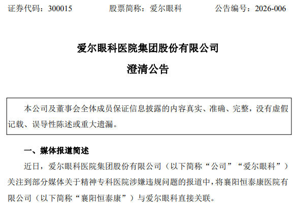 爱尔眼科称,襄阳恒泰康非爱尔眼科所属企业。