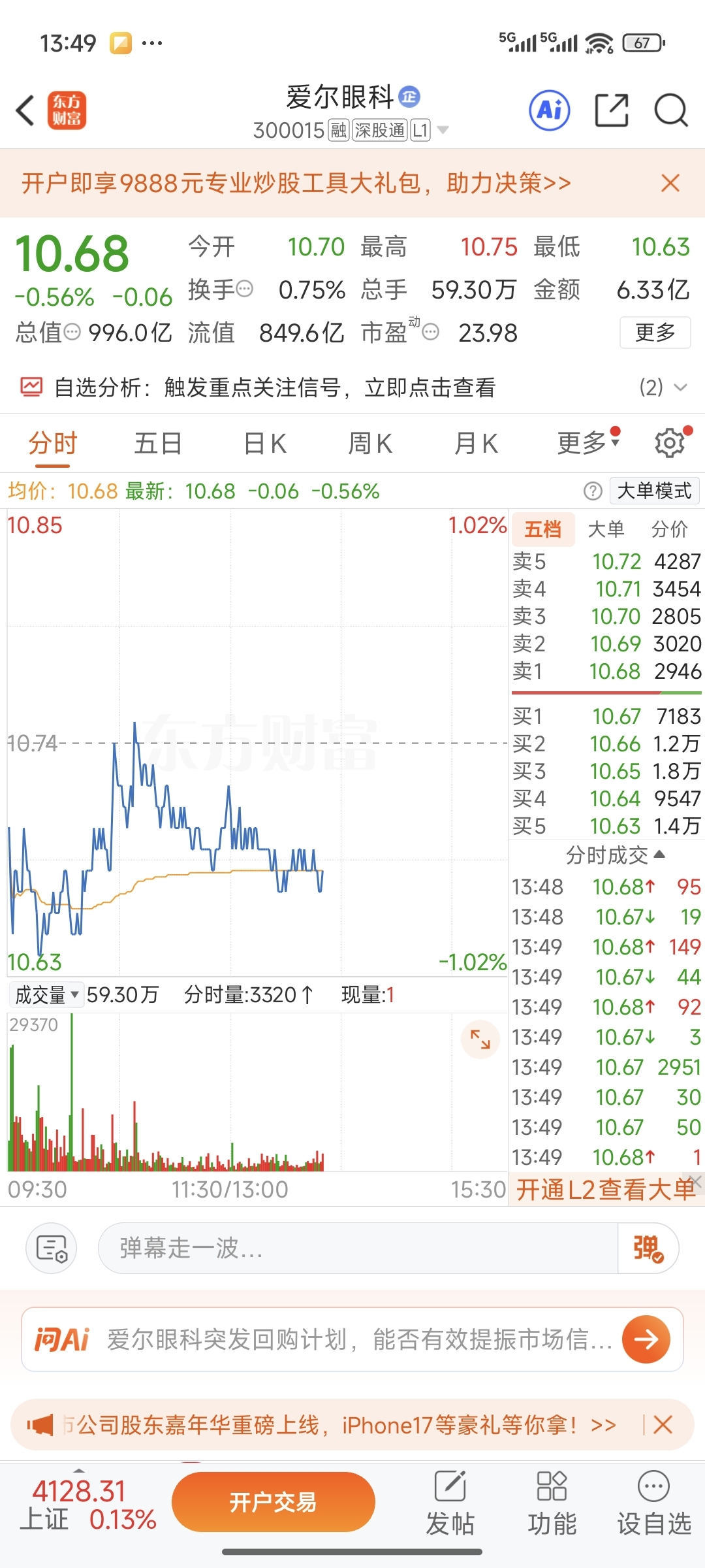 看这手没,不要买10.68,就挂10.67,追高杀跌,在下行的时候在下面挂单,不