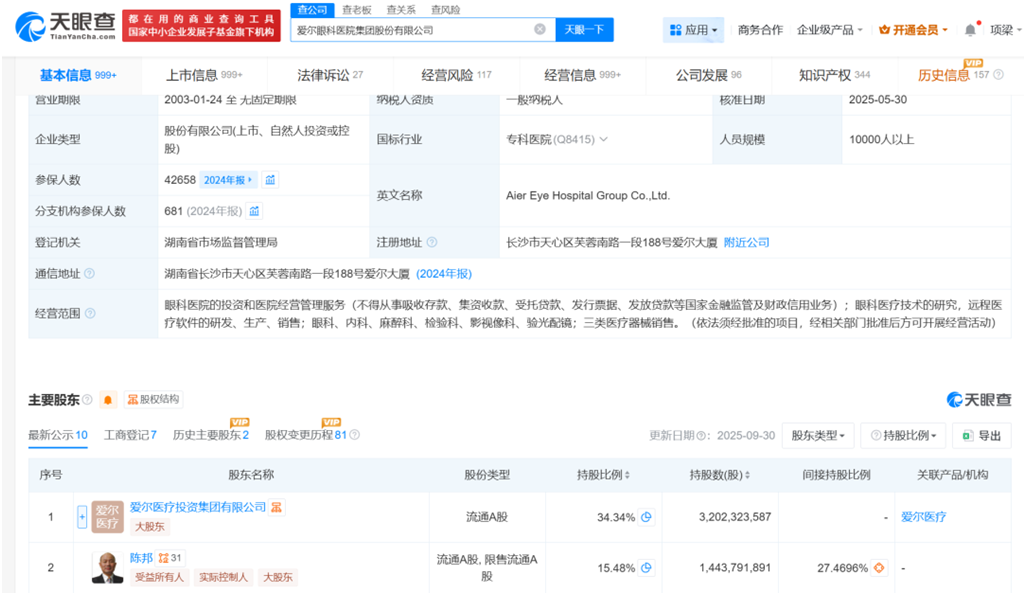 值得注意的是,爱尔医疗投资集团正是上市公司爱尔眼科的第一大股东,持股比例达34.34%。陈邦通过持有爱尔医疗投资集团79.99%的股份,为最终实际控制人。