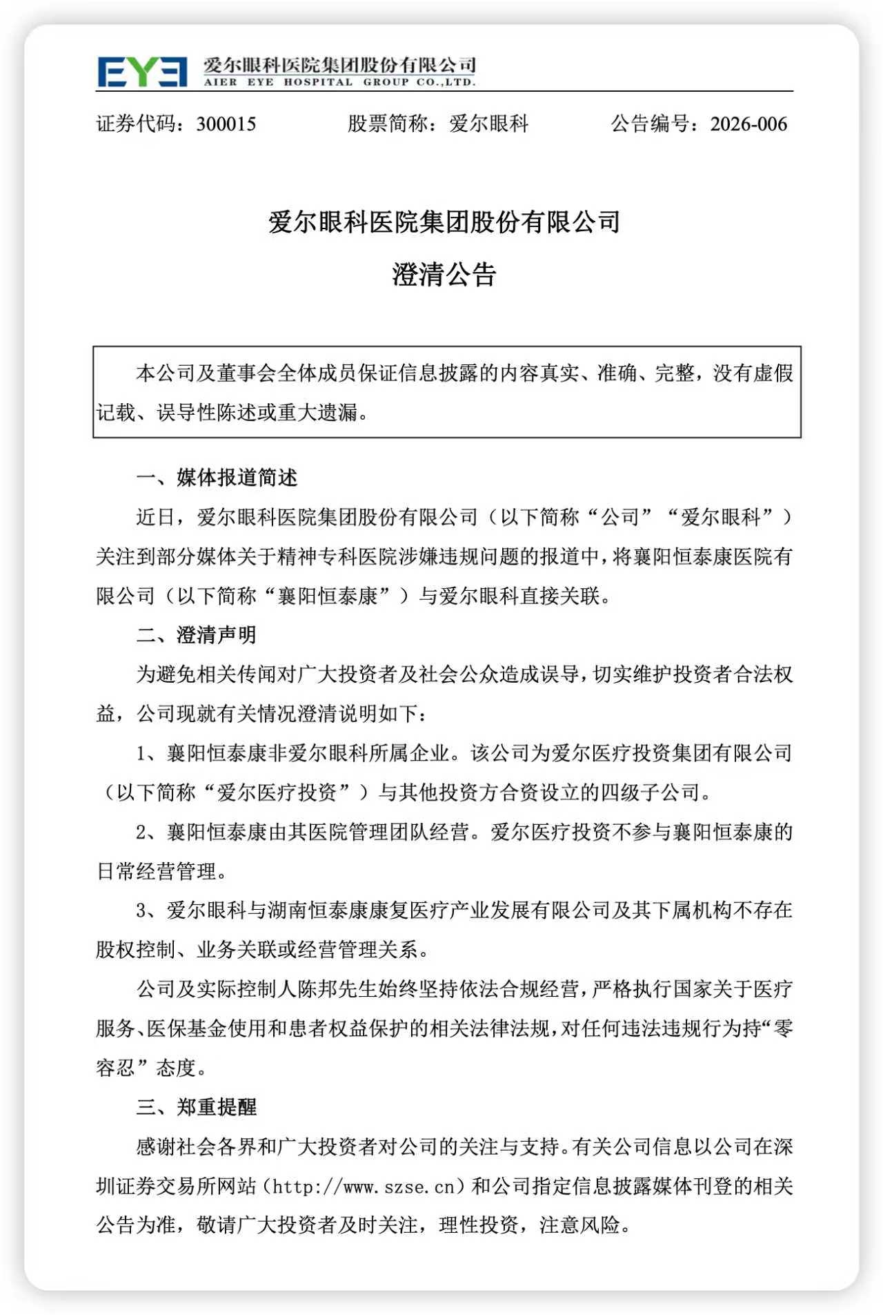 $爱尔眼科(SZ300015)$ 明天看涨,利空影响已经消化,和爱尔集团没有关系