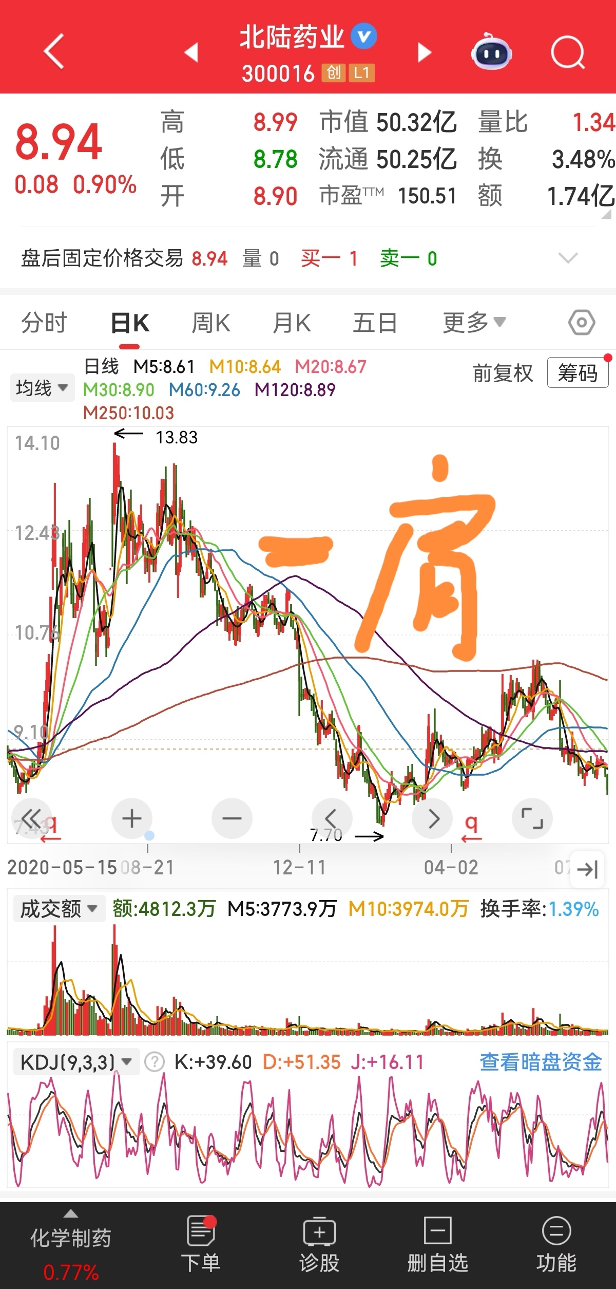 $北陆药业(SZ300016)$ 盘久必跌,开启下一台阶模式,怎么个下台阶法,如上一次13元大顶的走势,记