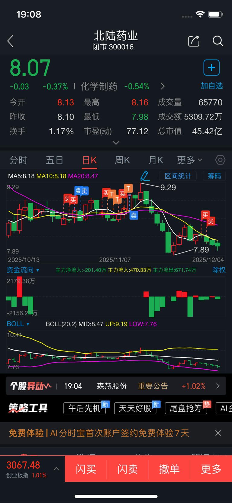 $北陆药业(SZ300016)$ 今天继续加2w股、越跌越买、空狗有本事砸跌停我好梭哈