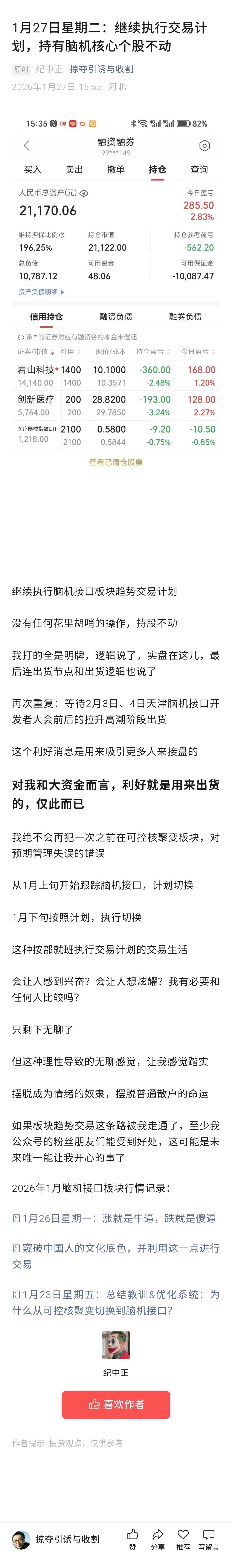 1月27日星期二:接着执行交易计划,持脑机接口核心个股不动