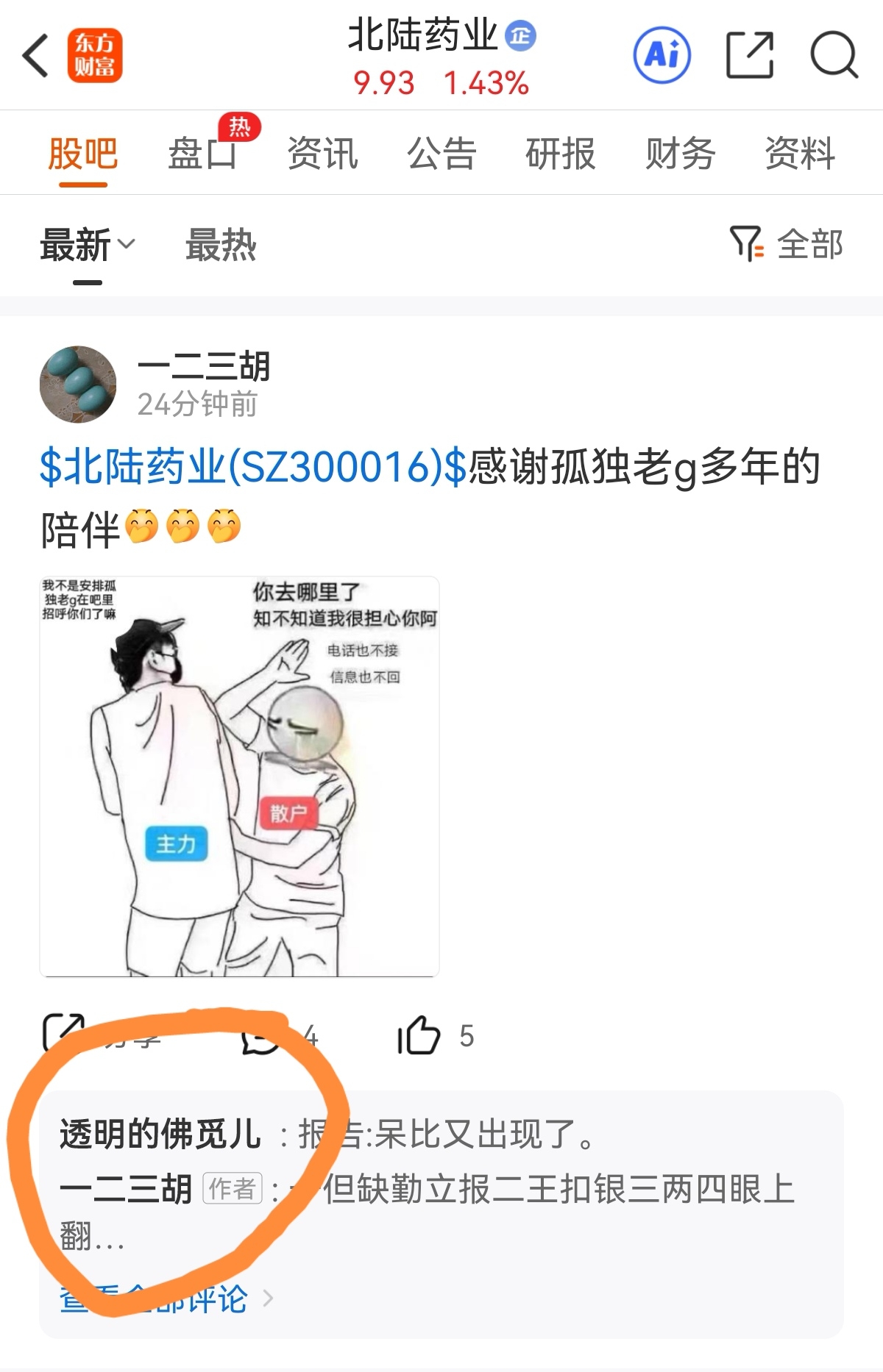 $北陆药业(SZ300016)$ 兄弟俩又出来了,被套的最久的俩,多年了,当年爹爹说对了,13元多跌到3.53,恨透了爹爹,这是深套组合呀,他们看好证明又要跌了,如果他们是对的,就不可能被套多年,其实他们要和自己的思维反着做才行,记
