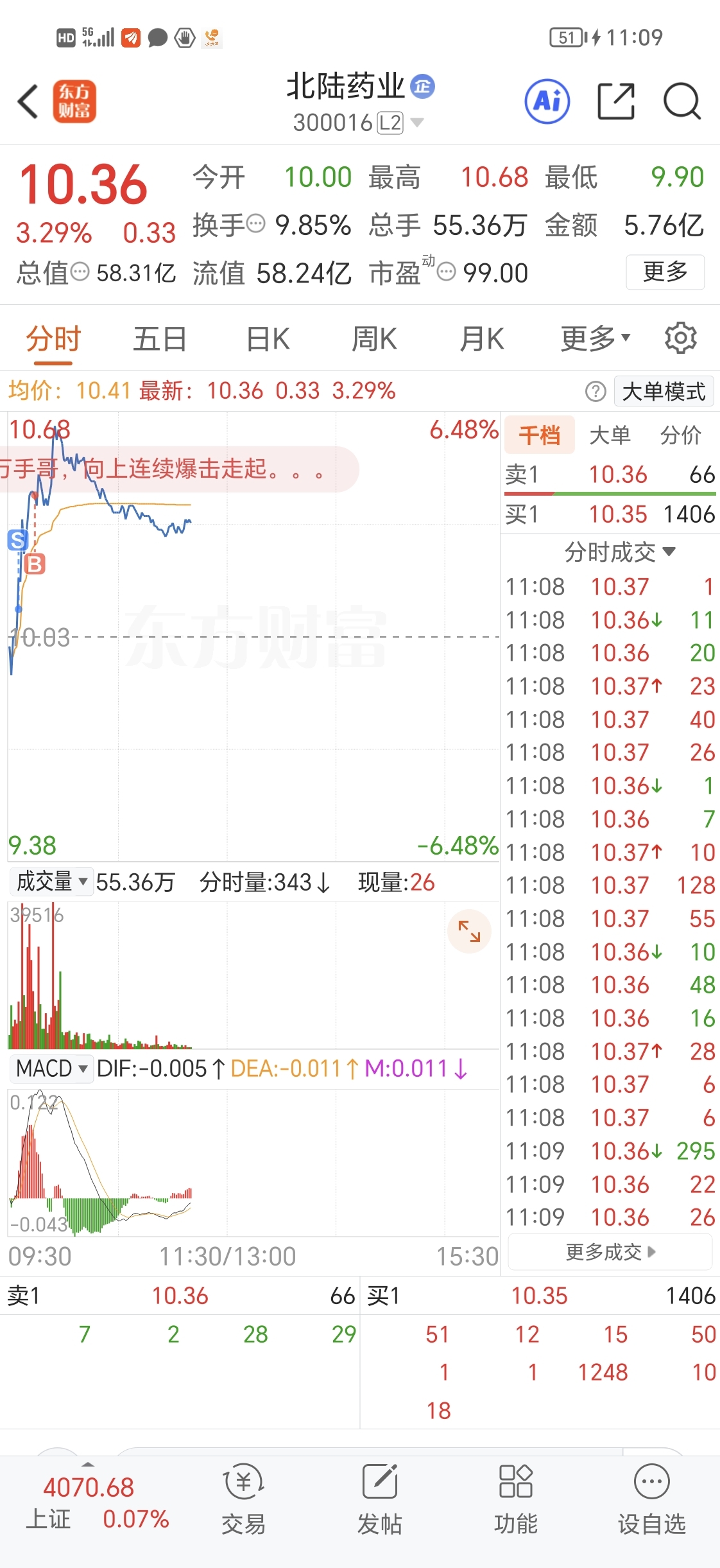 $北陆药业(SZ300016)$ 最近几周大盘一直跌,我不应该亏钱,总是神仙操作,昨天留了一点底仓,今天1个点卖了,4个点接回来。虽然这些仓位都很少,但是总是扔钱太不应该了