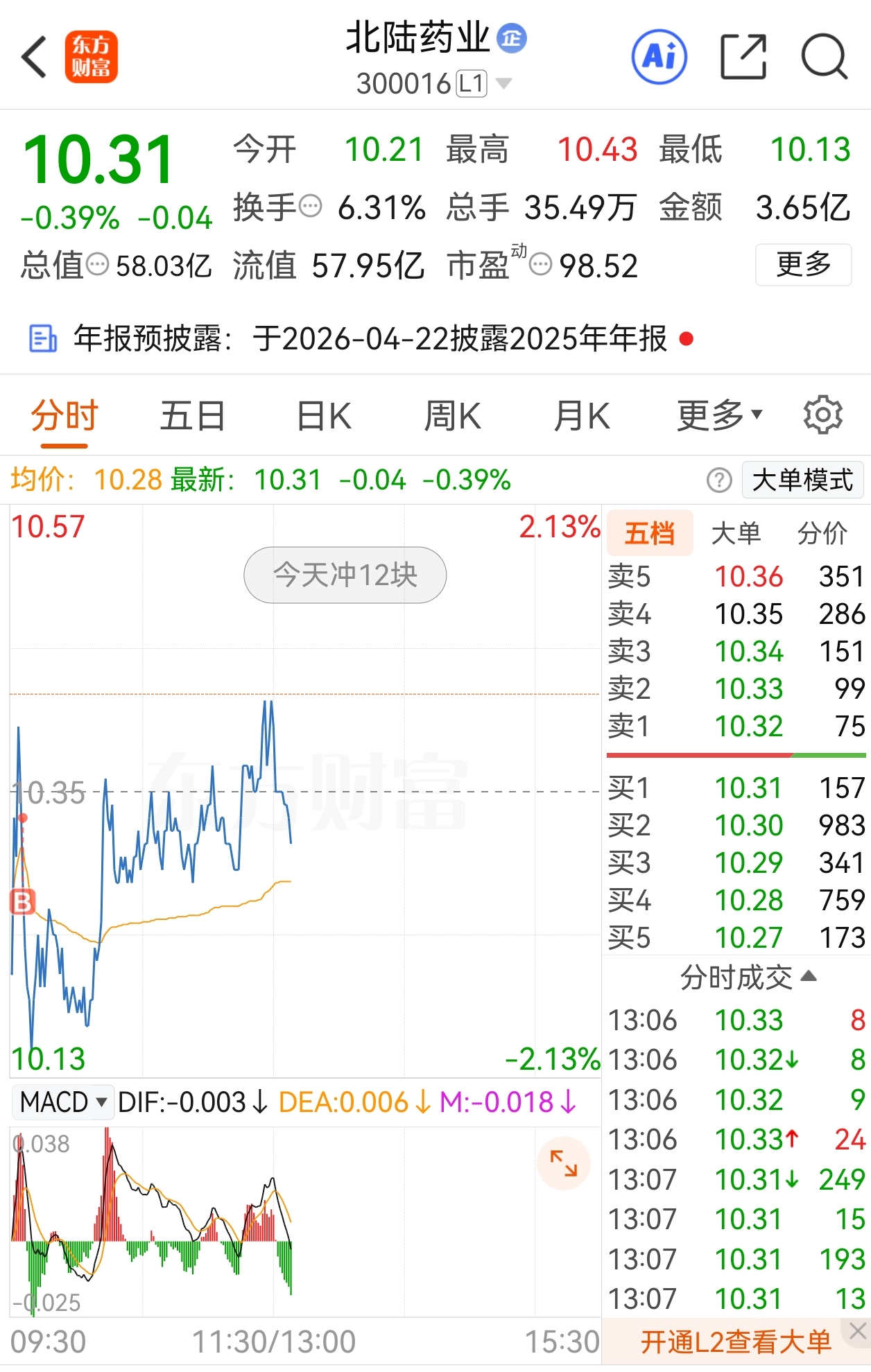 $北陆药业(SZ300016)$ 今天冲12块吧