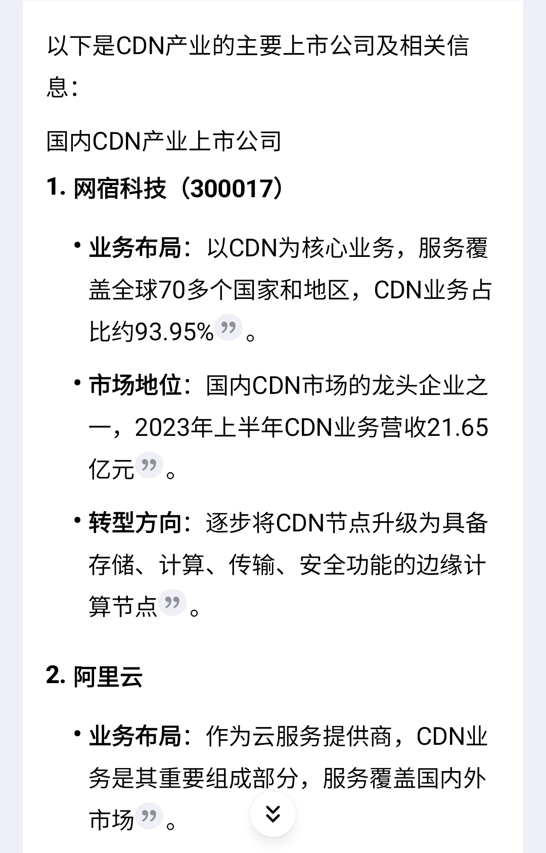 网宿科技(300017)• 业务布局:以CDN为核心业务,服务覆盖全球70多个国家和地区,CDN业务占比约93.95%[^0^]。• 市场地位:国内CDN市场的龙头企业之一