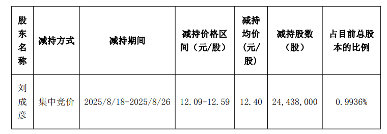 公告称,本次减持后,刘成彦决定提前终止其于2025年7月10日公告的减持计划,剩余未减持股份2481.3757万股在本次减持计划期间内不再减持。