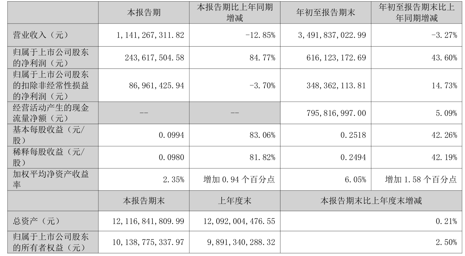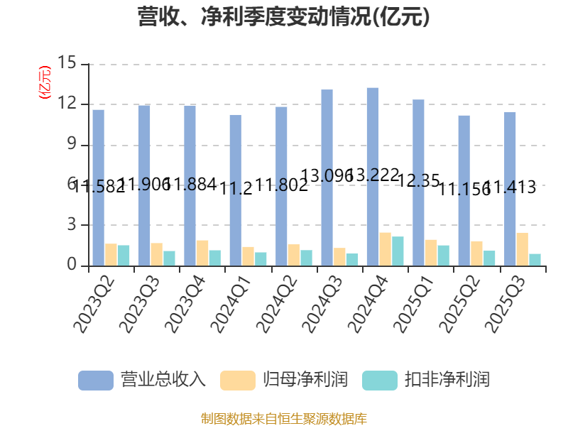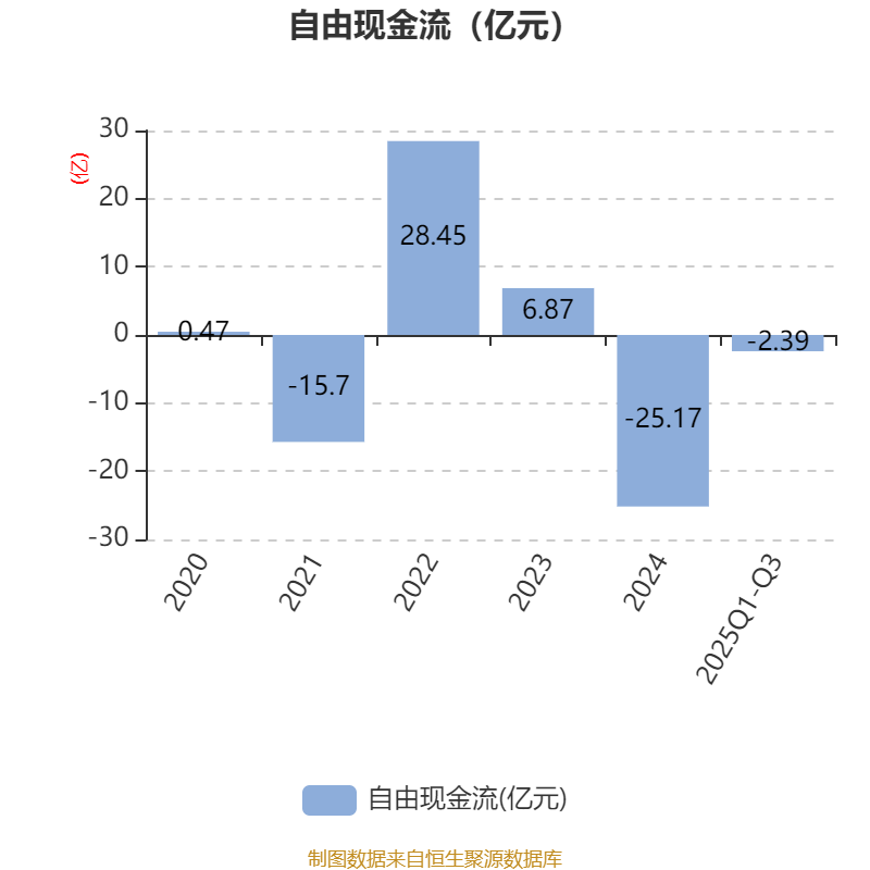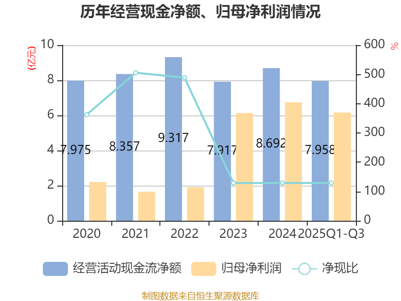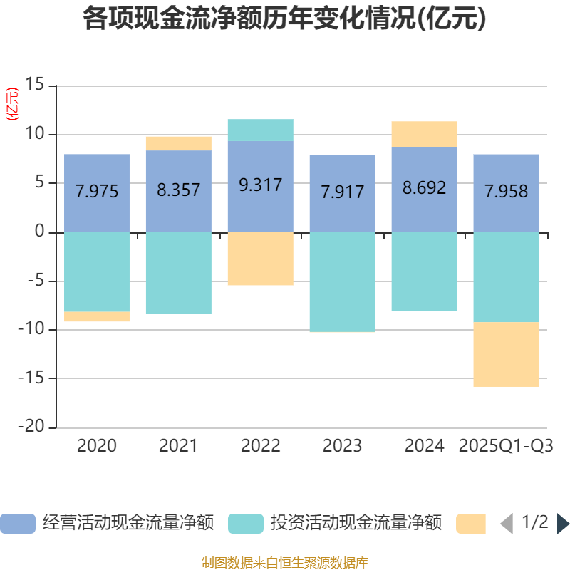 2025年前三季度,公司经营活动现金流净额为7.96亿元,同比增长5.09%;筹资活动现金流净额-6.62亿元,同比减少9.74亿元;投资活动现金流净额-9.22亿元,上年同期为-9.5亿元。
