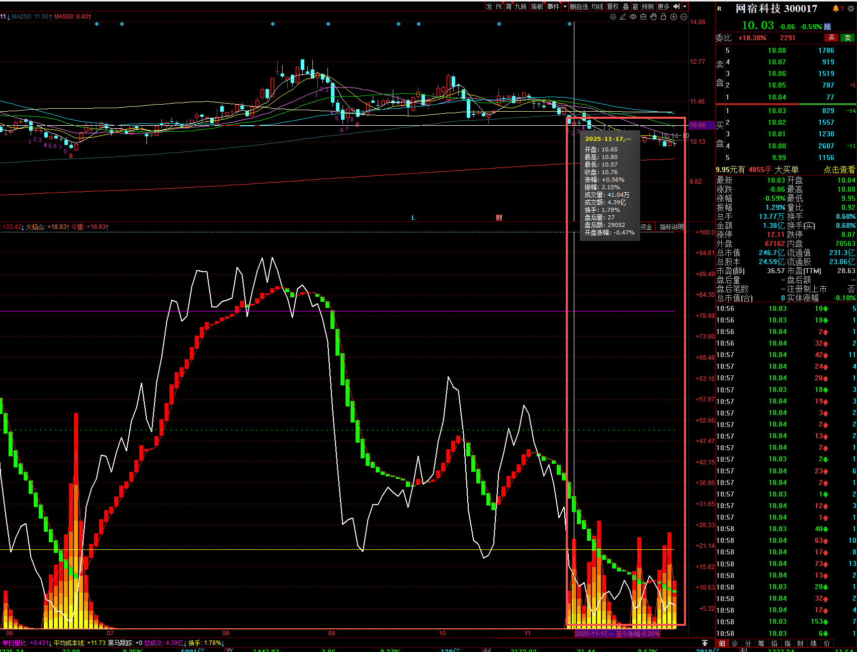 网宿科技是大股东配合打压,已经打压了一年了,最近10.9元一路下跌中,都有出现火焰图,等待减持才有机会。