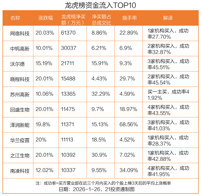 1月26日,上证指数下跌0.09%,深证成指下跌0.85%,创业板指下跌0.91%。盘后龙虎榜数据显示,共有56只个股因当日异动登上龙虎榜,资金净流入最多的是网宿科技(300017.SZ),达6.14亿元。