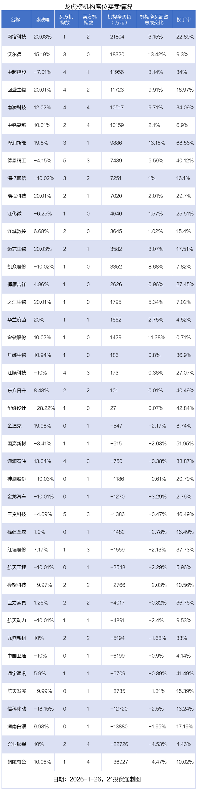 1月26日,42只个股龙虎榜出现了机构的身影,机构合计净买入3175.02万元。具体来看,机构净买入22股,净卖出20股。