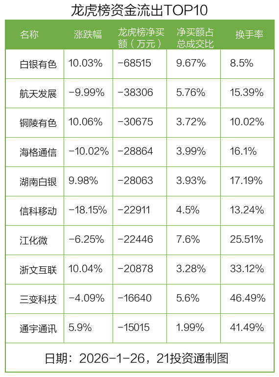 而龙虎榜中资金净流出最多的是白银有色(601212.SH),被净卖出为6.85亿元,占总成交金额的9.67%。白银有色收盘上涨10.03%,换手率为8.5%。