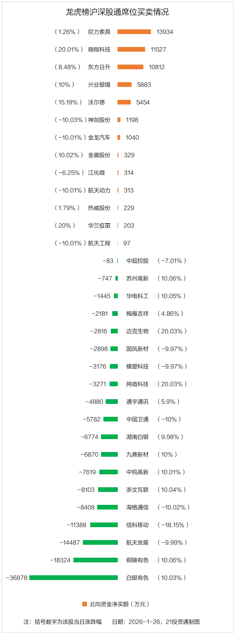 1月26日,北向资金参与龙虎榜中的个股共有32只,合计净卖出9.48亿元。其中沪股通净买入7 股,净卖出7 股,合计净卖出5.87亿元;深股通净买入6 股,净卖出12 股,合计净卖出3.6亿元。