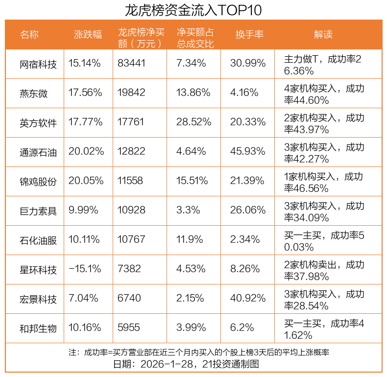 1月28日,上证指数上涨0.27%,深证成指上涨0.09%,创业板指下跌0.57%。盘后龙虎榜数据显示,共有54只个股因当日异动登上龙虎榜,资金净流入最多的是网宿科技(300017.SZ),达8.34亿元。