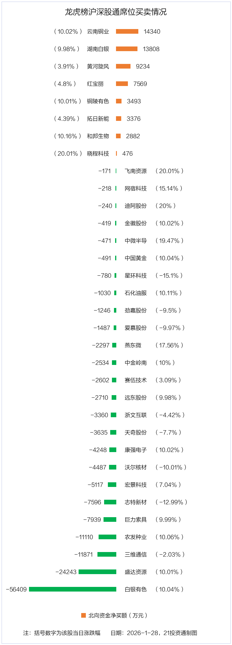 北向资金净买入金额最多的是云南铜业(000878.SZ),净买入1.43亿元,占总成交金额的2.89%。净卖出金额最多的是白银有色(601212.SH),为5.64亿元,占总成交金额的10.43%,当日收盘上涨10.04%,换手率为5.42%。