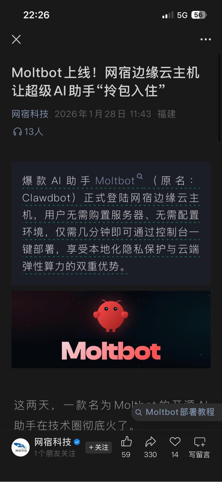 $网宿科技(SZ300017)$ Moltbot上线!网宿边缘云主机让超级AI助手“拎包入住”