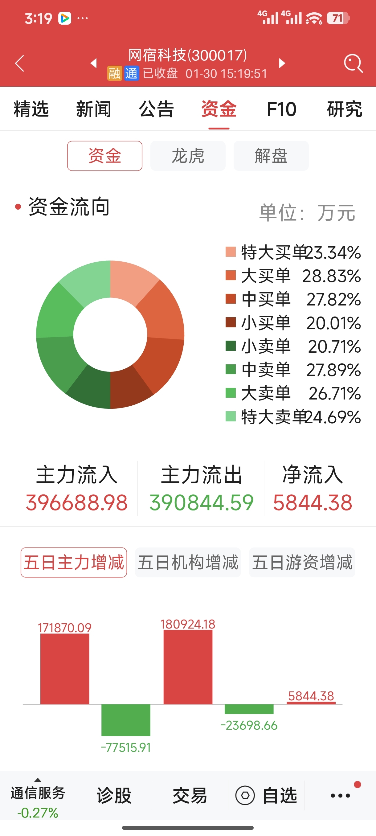 网宿除了开盘有一笔大单抛压外,其余时间都是大单进小单出,最后半小时从净流出112