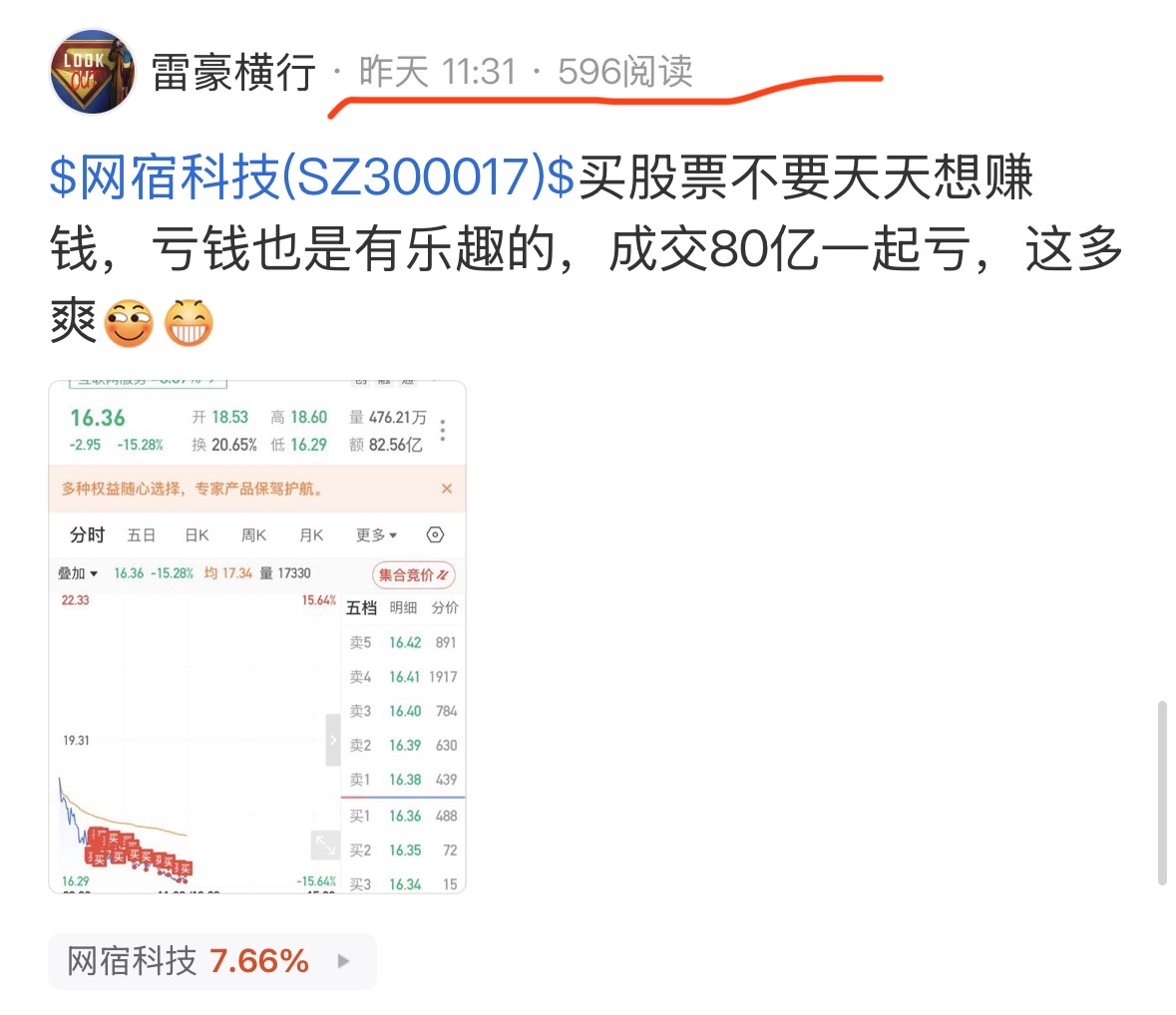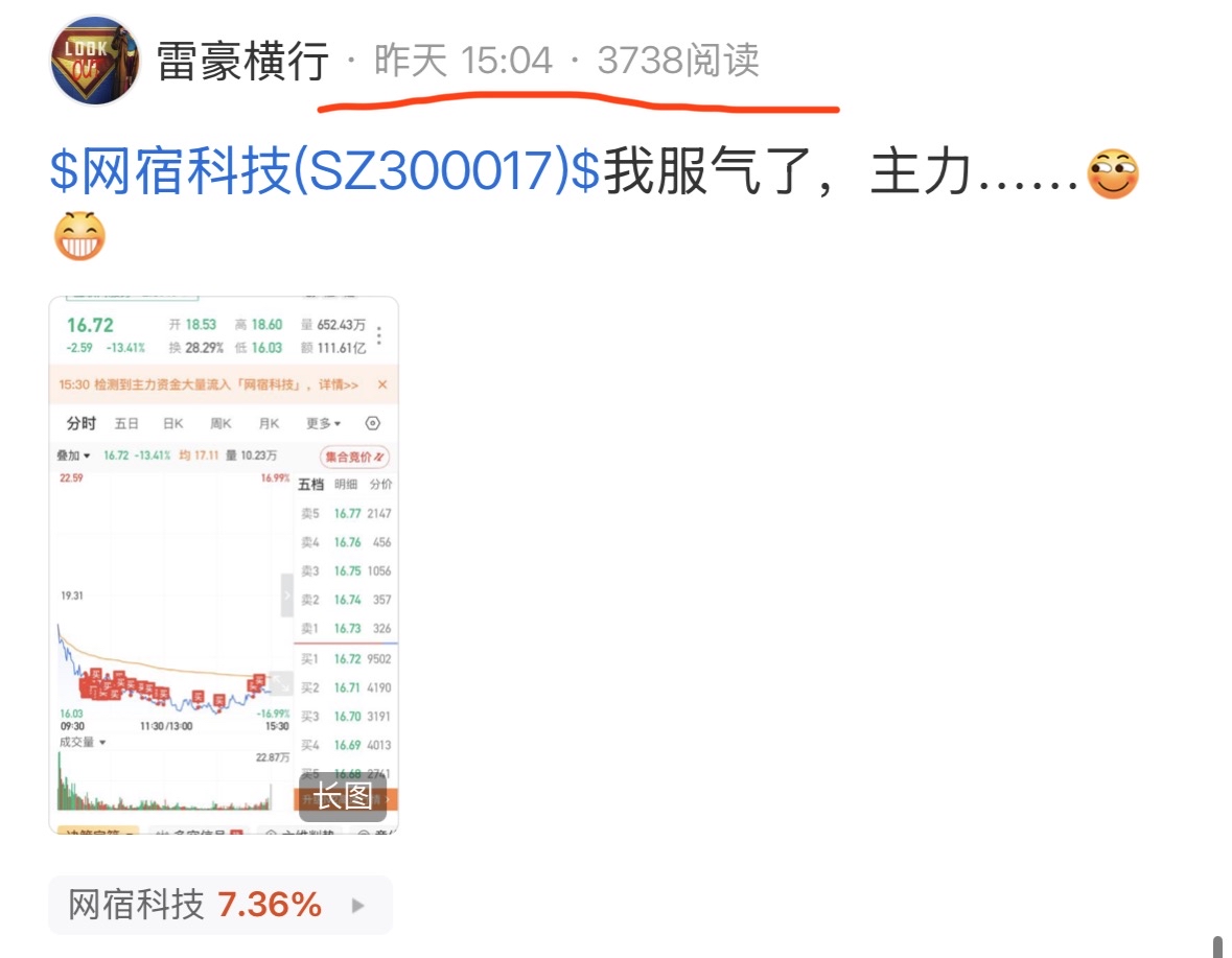 $网宿科技(SZ300017)$ 我赚钱理所当然,你不看看我昨天的操作,昨天股吧什么帖子?有谁这么买?我再说一次,成交额,成交量,是大资金选股第一逻辑,没量的股涨停都没用,他装不下钱,也可能出不来,你5万,10万当然感觉不了……当你1000万,5000万,那区别就大了,恰恰股票涨需要大资金看上,我的真实想法,没量就是垃圾……