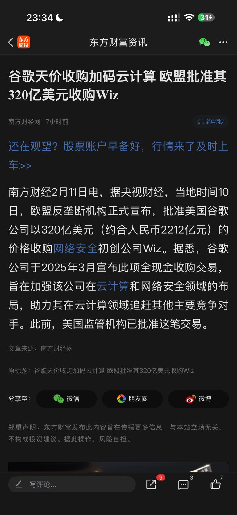 $网宿科技(SZ300017)$ 批准美国谷歌公司以320亿美元(约合人民币2212亿元)的价格收购网络安全初创公司Wiz。据悉,谷歌公司于2025年3月宣布此项全现金收购交易,旨在加强该公司在云计算和网络安全领域的布局,助力其在云计算领域追赶其他主要竟争对手。此前,美国监管机构已批准这笔交易。