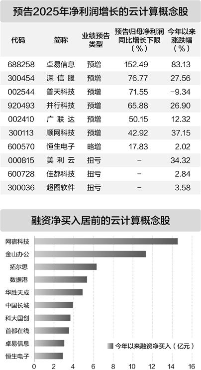 据证券时报·数据宝统计,A股市场中云计算概念股共有62只,其中39股已公布2025年度业绩预告,其中3股预计扭亏为盈,10股预计同比减亏,7股预计同比增长。按预告归母净利润同比增长下限来看,卓易信息、深信服、普天科技预计增幅居前。