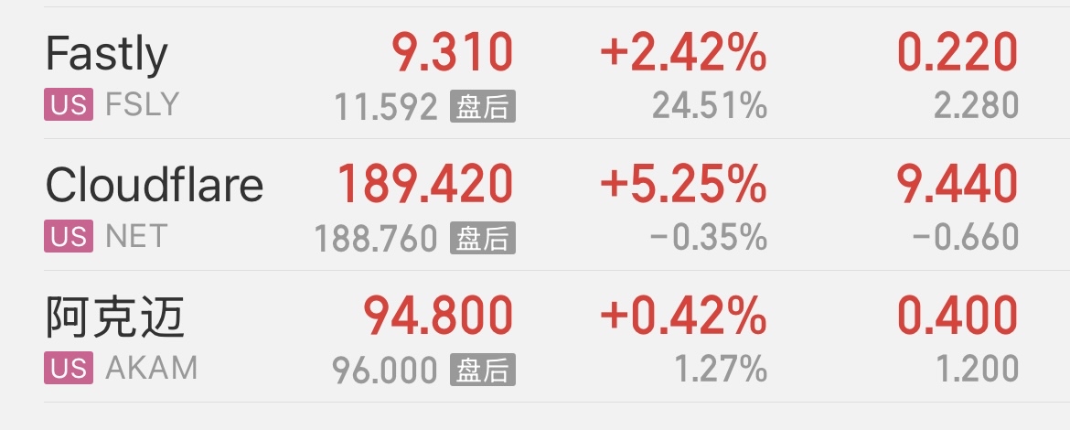 美股对标的3个股红盘收盘,fastly盘后分时目前大涨