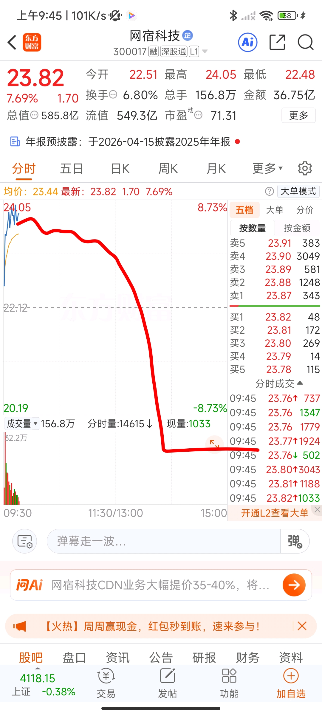 $网宿科技(SZ300017)$ 已经卖出的小散户,不用着急,这票今天最终肯定下来的,他是蓝色光标的后排,不信你们可以去看一下,蓝色光标也是从16块开始涨到了24.5元左右,所以网宿最高价不可能超过25的,这都是主力量化设定好的价格。最终都是骗你们散户接盘然后大跌的。