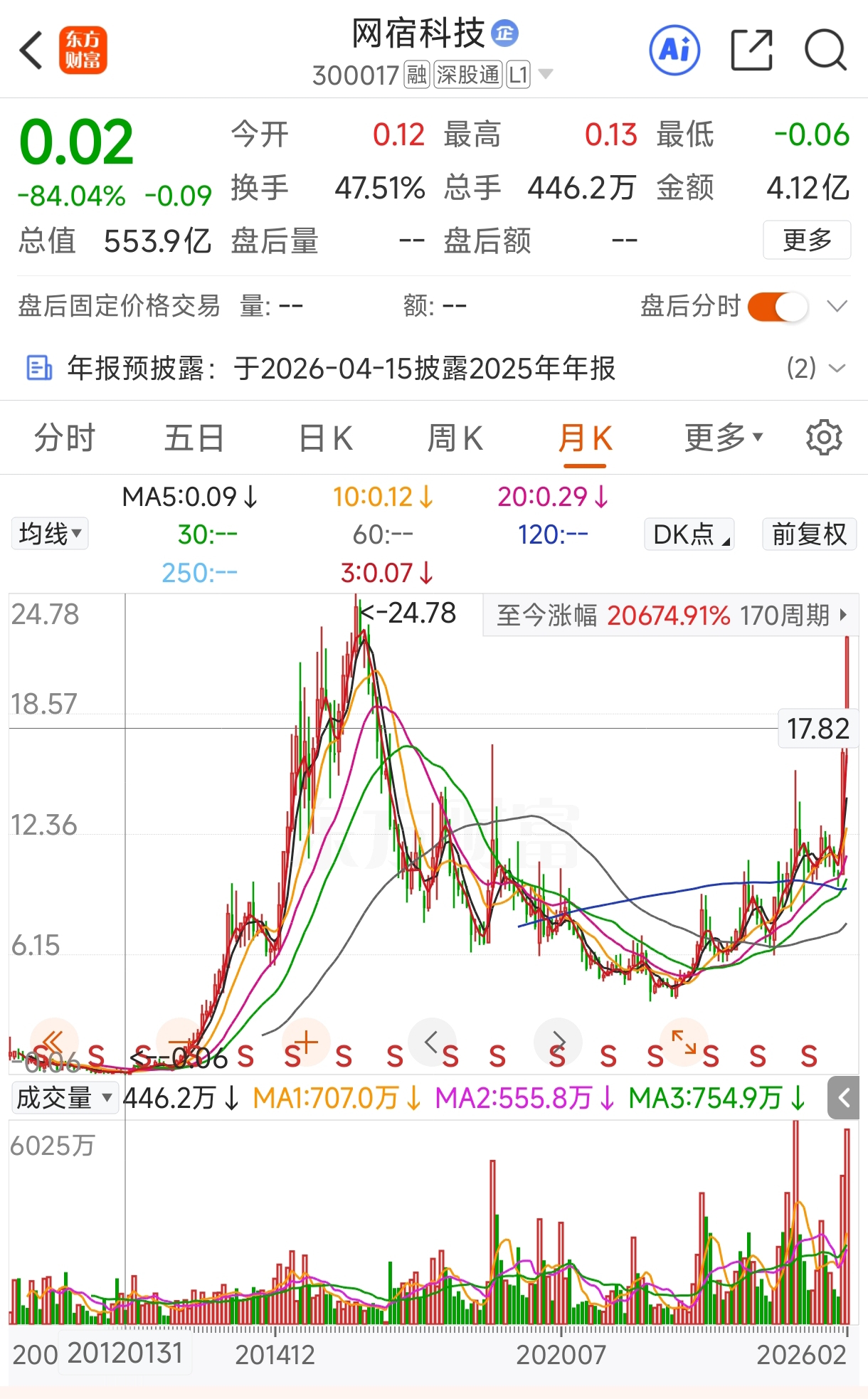 网宿科技最低0.02元,最高24.78元,现价22.52元,1100倍涨幅。