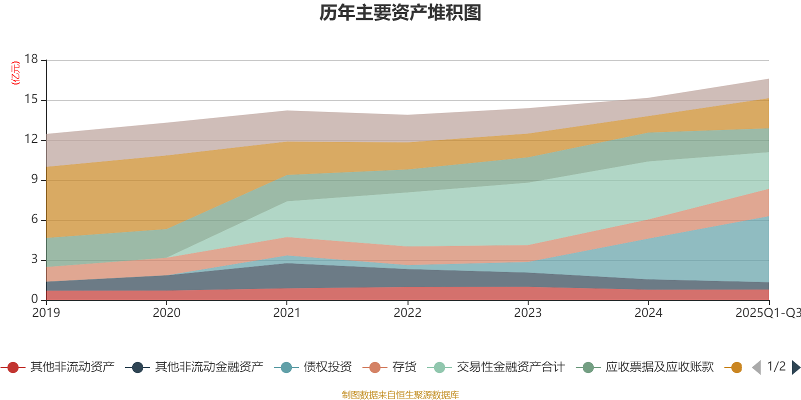 资产重大变化方面,截至2025年三季度末,公司交易性金融资产合计较上年末减少36.78%,占公司总资产比重下降12.13个百分点;债权投资较上年末增加62.04%,占公司总资产比重上升9.67个百分点;货币资金较上年末增加82.73%,占公司总资产比重上升5.46个百分点;应收票据及应收账款较上年末减少17.34%,占公司总资产比重下降3.51个百分点。