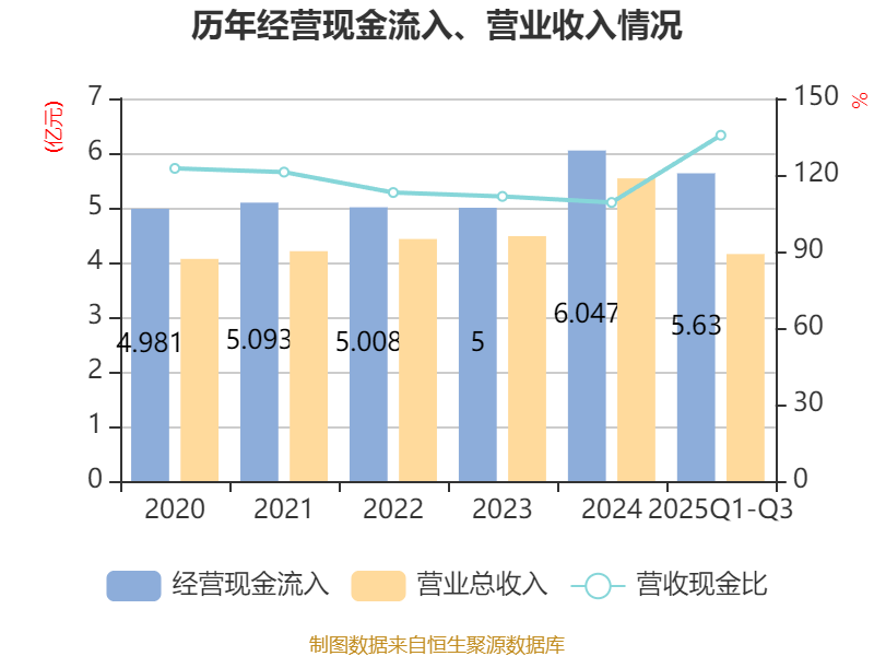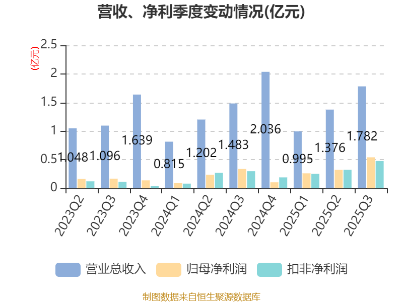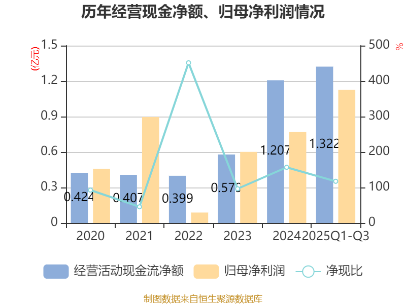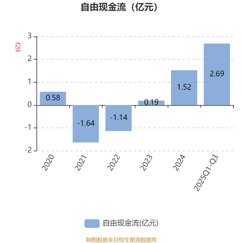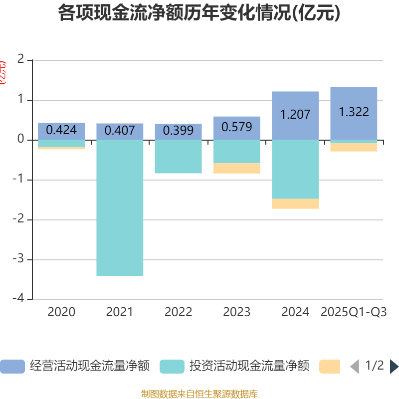 2025年前三季度,公司经营活动现金流净额为1.32亿元,同比增长94.65%;筹资活动现金流净额-2093.24万元,同比增加326.61万元;投资活动现金流净额-868.21万元,上年同期为-1.13亿元。