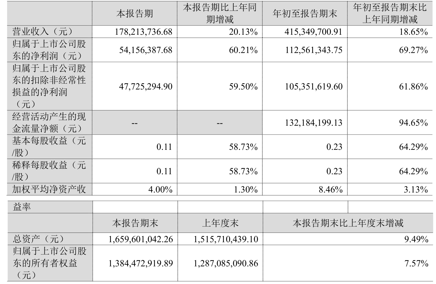 中证智能财讯中元股份(300018)10月23日披露2025年第三季度报告。前三季度公司实现营业总收入4.15亿元,同比增长18.65%;归母净利润1.13亿元,同比增长69.27%;扣非净利润1.05亿元,同比增长61.86%;经营活动产生的现金流量净额为1.32亿元,同比增长94.65%;报告期内,中元股份基本每股收益为0.23元,加权平均净资产收益率为8.46%。