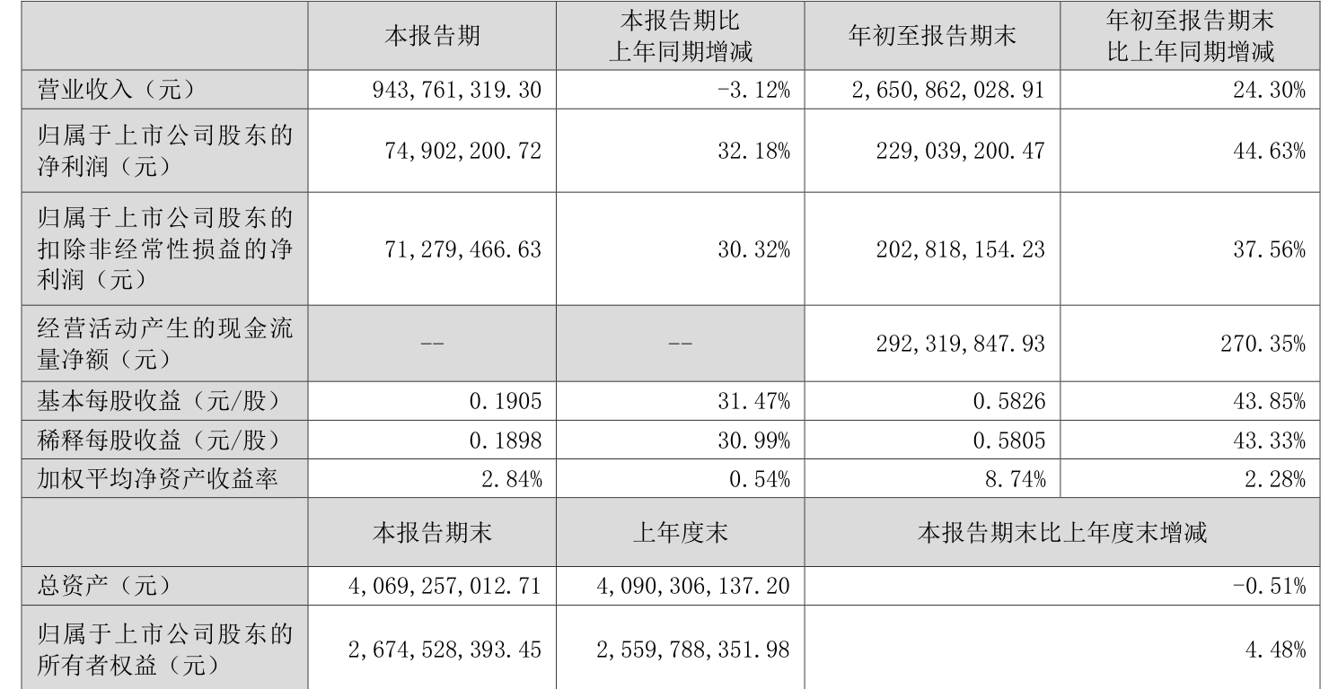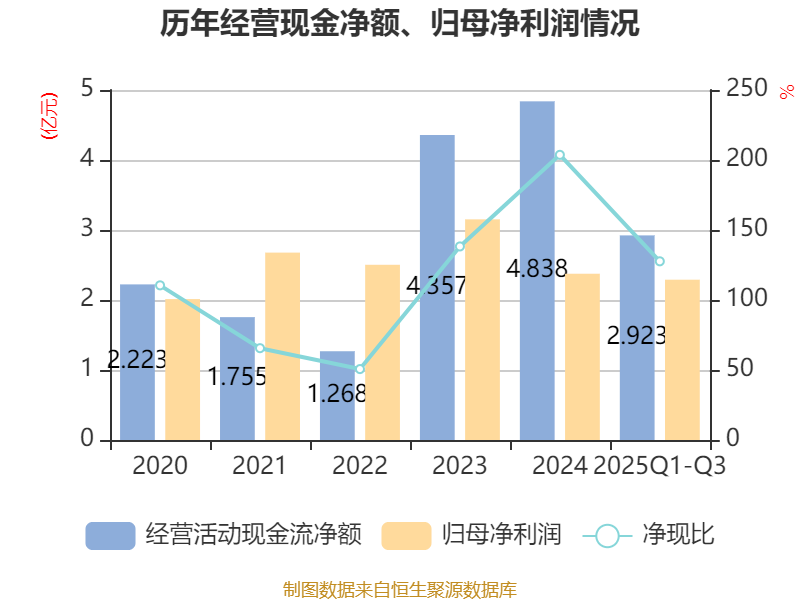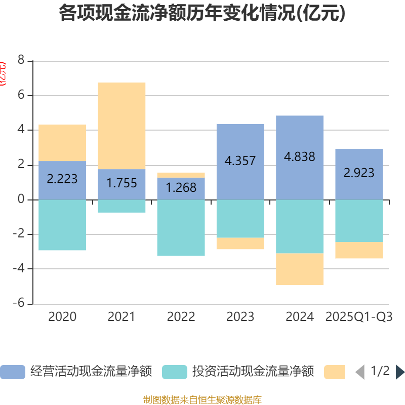 2025年前三季度,公司经营活动现金流净额为2.92亿元,同比增长270.35%;筹资活动现金流净额-9397.57万元,同比减少4010.73万元;投资活动现金流净额-2.45亿元,上年同期为-2.51亿元。