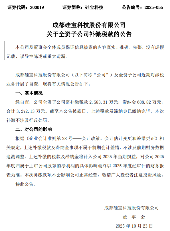 10月23日,硅宝科技(300019)公告,公司及全资子公司近期对涉税业务开展了自查,公司全资子公司需补缴税款2,583.31万元,滞纳金688.82万元,合计3,272.13万元。截至本公告披露日,上述税款及滞纳金已缴纳完毕,本次补缴不涉及行政处罚。