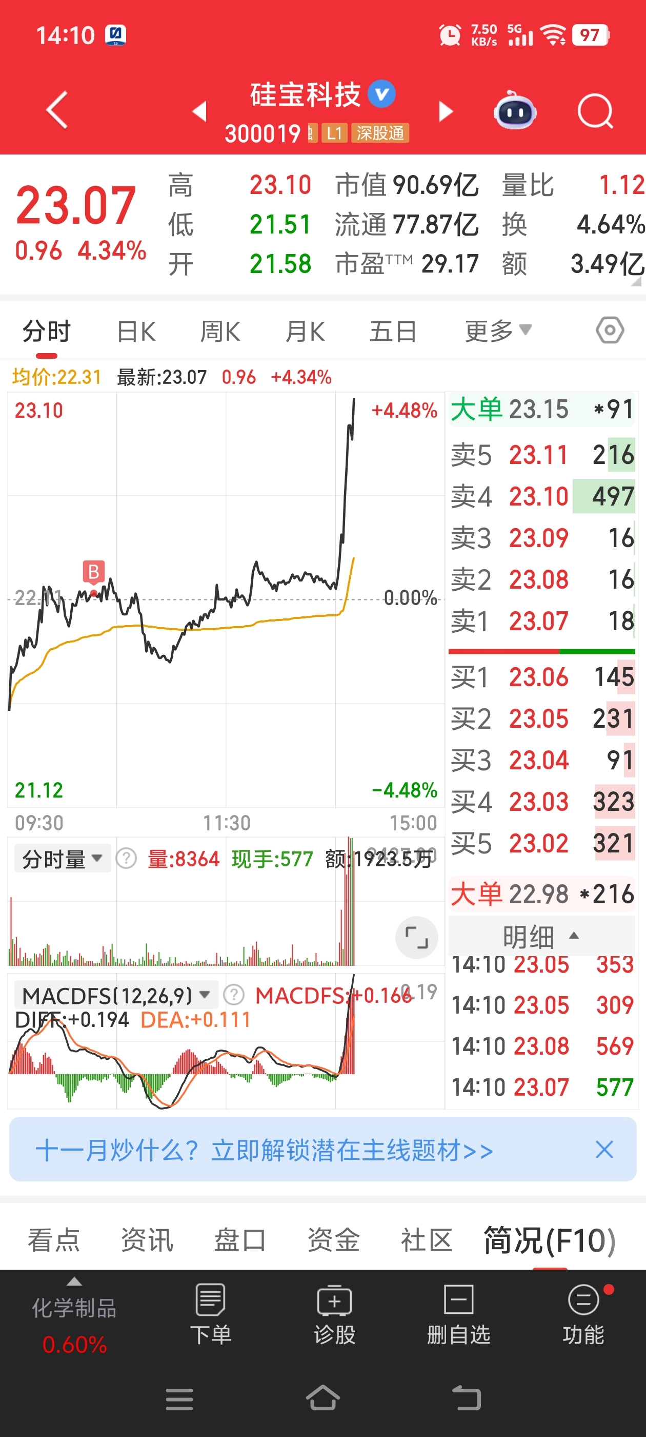 $硅宝科技(SZ300019)$ 记录自己,不做交易推荐,谢谢平台,可惜今天不能卖。