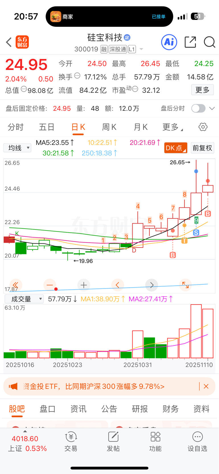 $硅宝科技(SZ300019)$ 这么好的走势,4条均线刚刚走顺,回落一点就一群人叽叽喳喳,这个股目前走势只要回调5日线随便买的好吗?26.65绝对不是这波最高点,19.96上来20个点涨幅?出货?