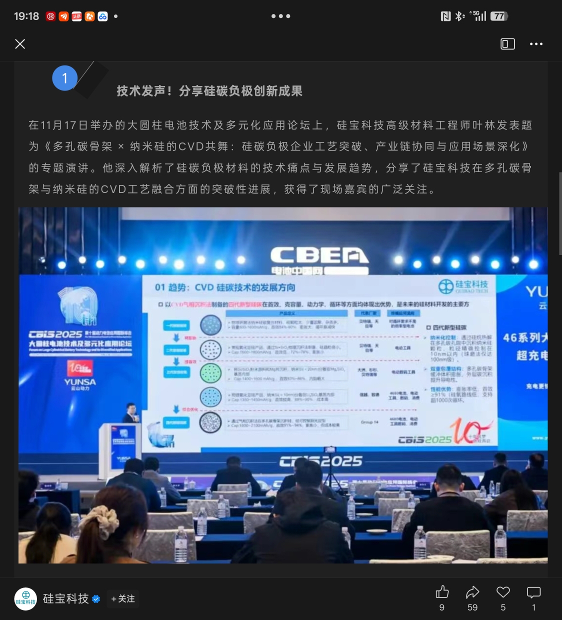 技术发声!分享硅碳负极创新成果在11月17日举办的大圆柱电池技术及多元化应用论坛上,硅宝科技高级材料工程师叶林发表题为《多孔碳骨架 × 纳米硅的CVD共舞:硅碳负极企业工艺突破、产业链协同与应用场景深化》的专题演讲。他深入解析了硅碳负极材料的技术痛点与发展趋势,分享了硅宝科技在多孔碳骨架与纳米硅的CVD工艺融合方面的突破性进展,获得了现场嘉宾的广泛关注。