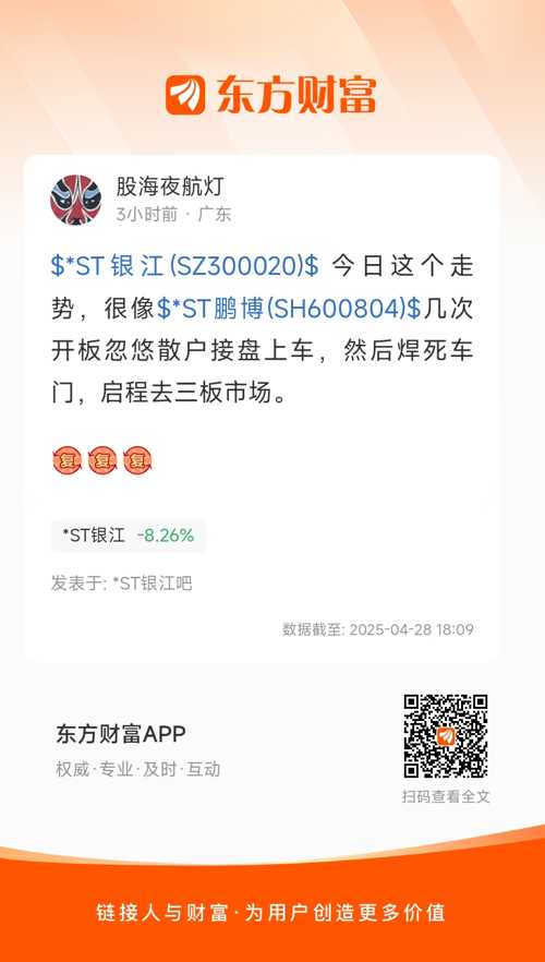 $*ST银江(SZ300020)$ 今日这个走势,很像$*ST鹏博(SH600804)$几次开板忽悠散户接盘上车,然后焊死车门,启程去三板市场。