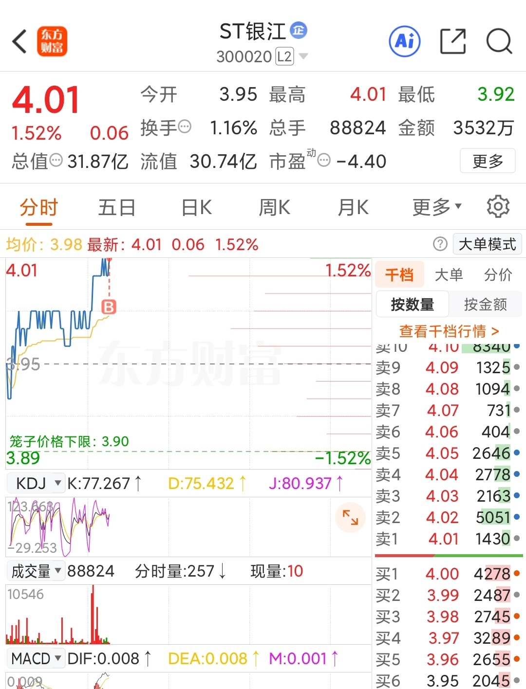 $ST银江(SZ300020)$ 庆祝破4,纪念一下。
