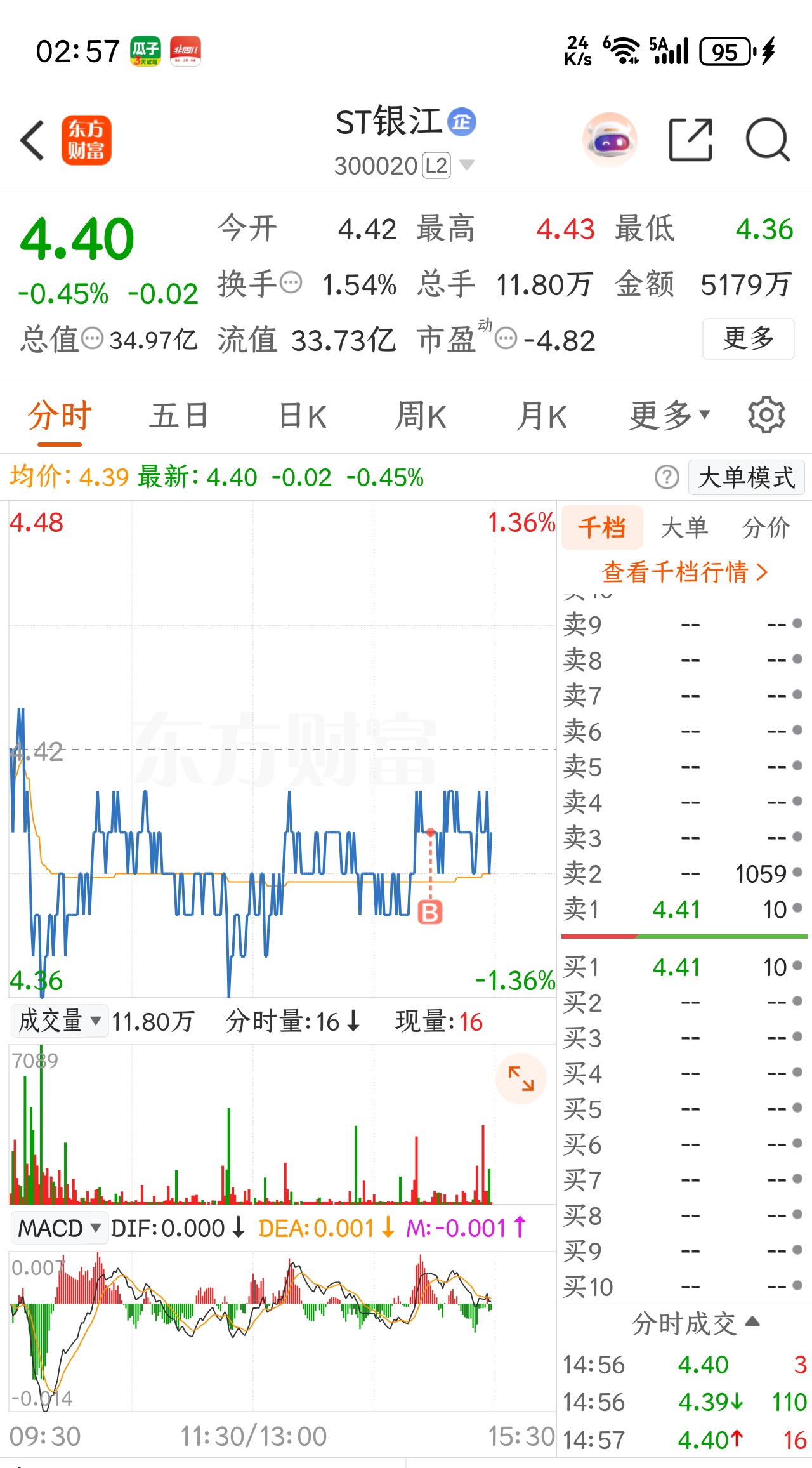 $ST银江(SZ300020)$ 今天把雪榕生物卖了,尾盘又进了荫降,也不清楚明天会咋样?心里忐忑不安!!!