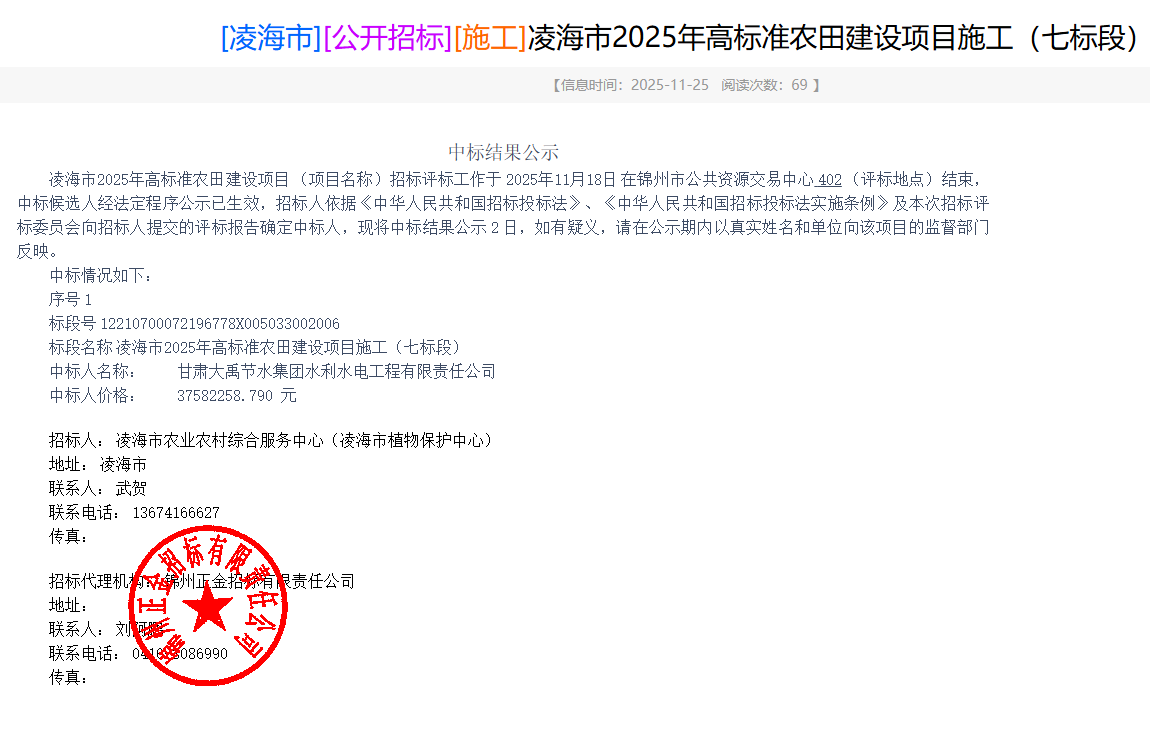 2025-11-27凌海市2025年高标准农田建设项目施工(七标段)中标人价格: